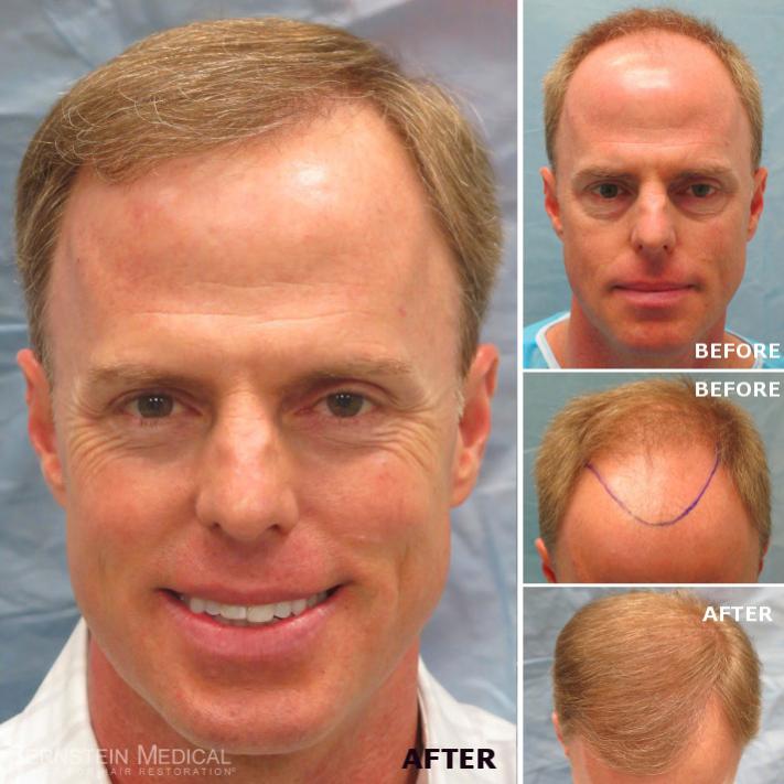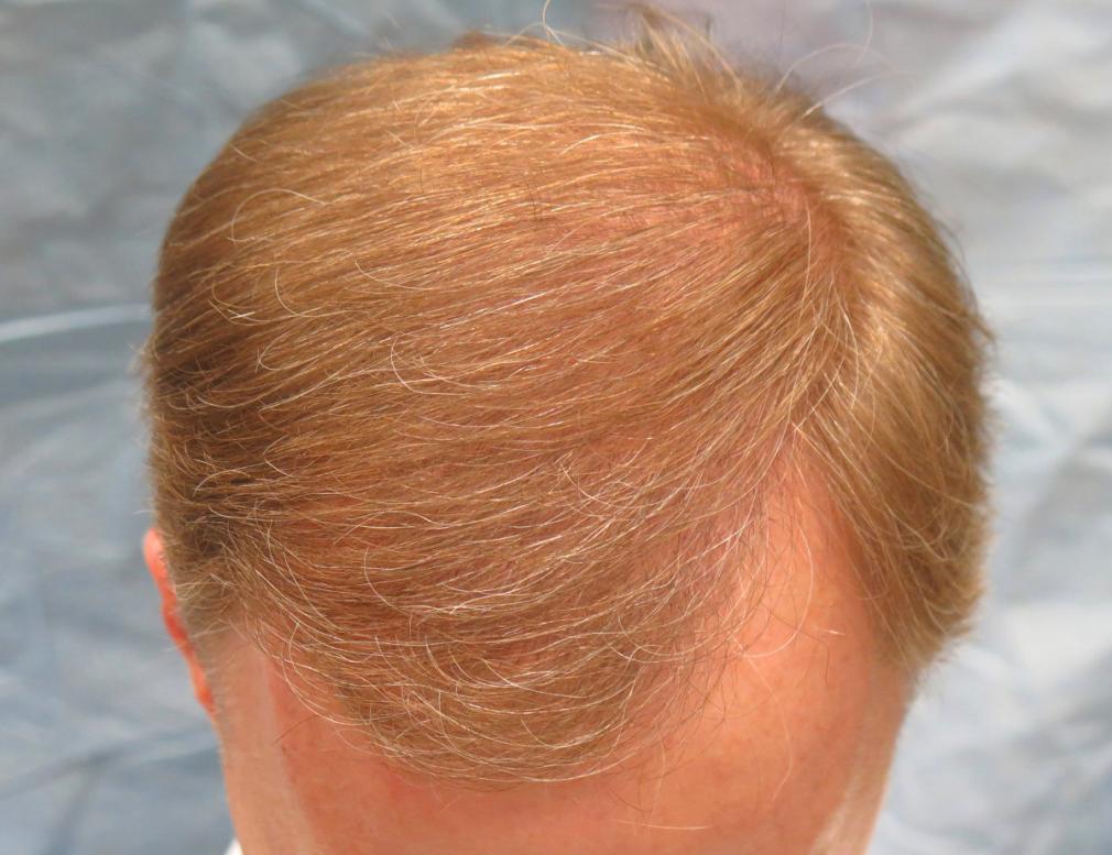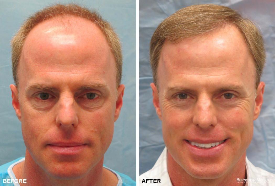 Bernstein Medical - Center for Hair Restoration Patient RFR is a Norwood Class 5A with blond hair and a donor density of 2.1 hairs/mm2. He had one hair transplant session of 2,144 follicular unit grafts. The results photos were taken one year after his surgical hair restoration procedure.