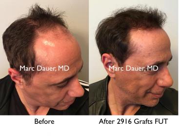 Here is a patient of mine who received 2917 grafts via FUT to the frontal scalp, mid scalp, and crown. The results are shown after 8 months so the patient should see some increased cosmetic density over the next 3-6 months.