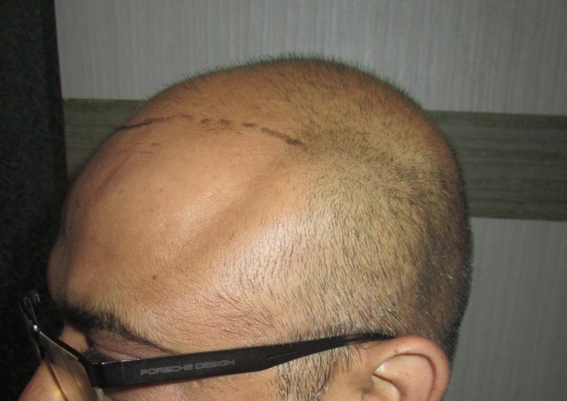 The first procedure involved extracting 2865 follicular unit grafts via FUE. Dr. Bhatti scored each and every graft and while one of his assistants helped to place the grafts into the recipient sites that he created. The results seen are from one year post surgery.
