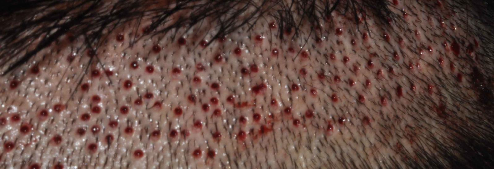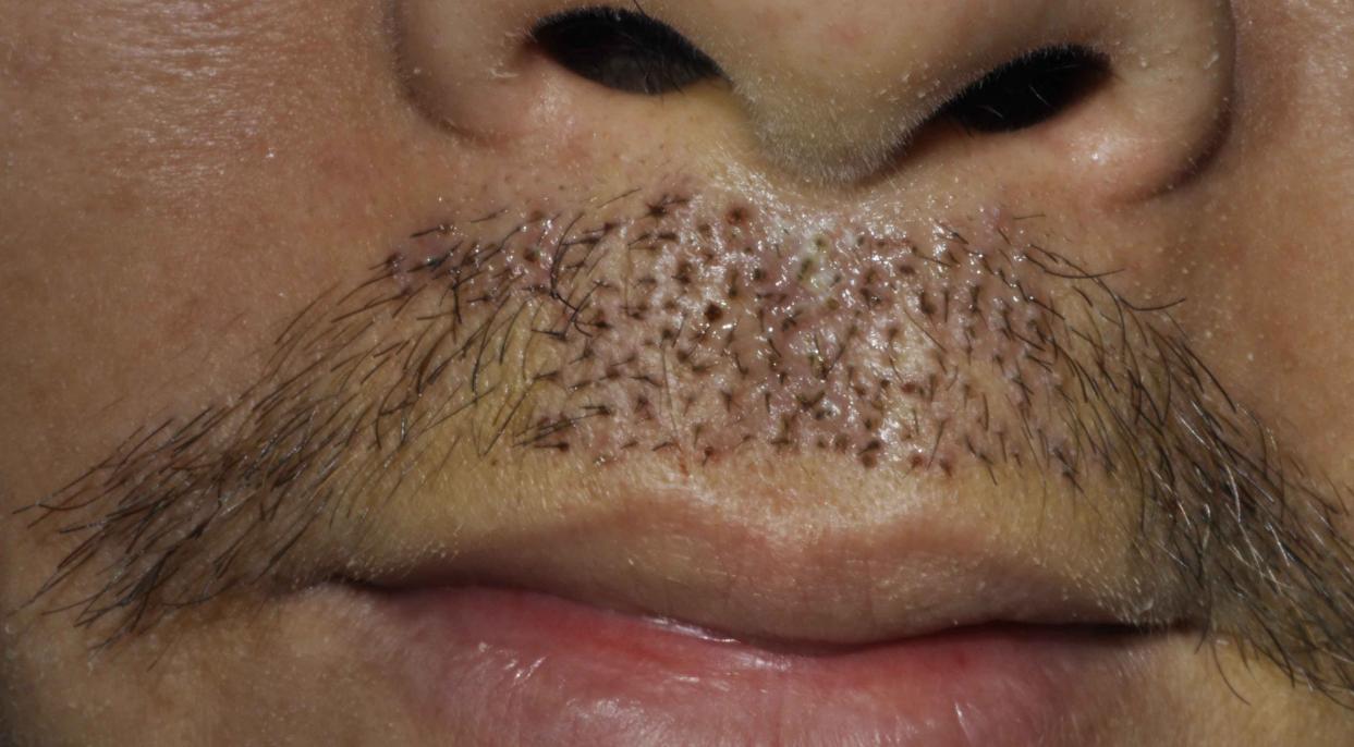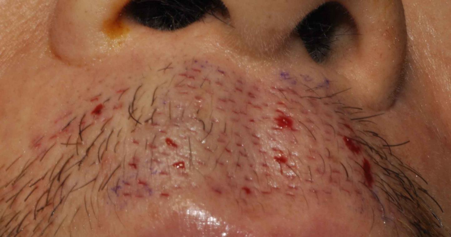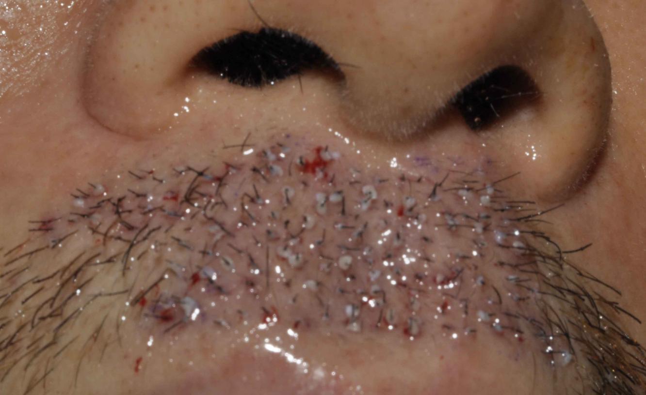 And we need the scalp hair to match the mustache area... OFTEN in men, the beard hair is so much thicker than the scalp or donor hair...that getting even a close match is difficult. Fortunately, this guy has similar hair on his head as he does in his beard region.