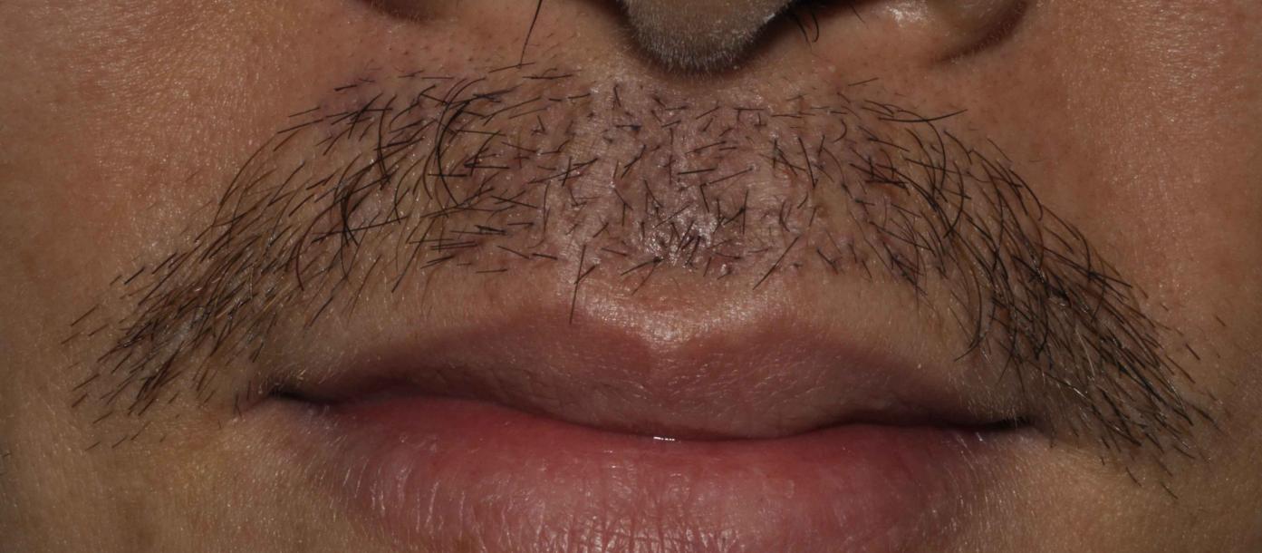 This is a bit of a unique case. This 30ish year old asian man never had central mustache hairs. Now we've done a bunch of HT into scars in the beard or brow area, but this is a tough one...due to constant moving of the recipient area (with eating, talking, smiling etc). Plus...he wears a short hairstyle so FUE is needed, but he has fine hairs and weaker roots...so FUE maybe will stress them on extraction....