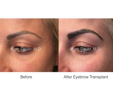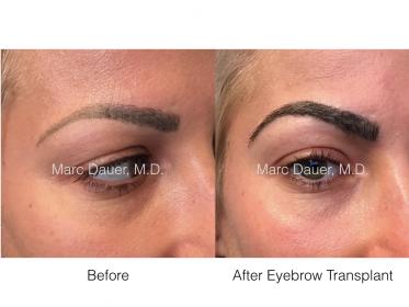 Here is a patient of mine who had a pre- existing eyebrow tattoo ("micro-blading") present. These tattoo's are marketed as completed natural replacements for eyebrow hair. In reality however this couldn't be further from the truth. A tattoo can never be a replacement for real hair. Hair is 3 dimensional on the face and a tattoo is not. Many of my patients present with eyebrow tattoos and then I place hairs over the tattoo to create a natural looking eyebrow. The tattoo then becomes like permanent makeup in the eyebrow. This patient received approximately 300 hairs per eyebrow. Note the specific directions of the eyebrow hair. She is thrilled with her results and I just performed an eyebrow transplant on her twin sister as well.