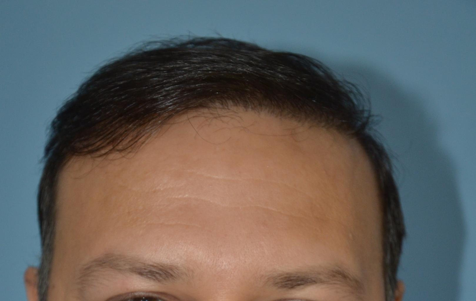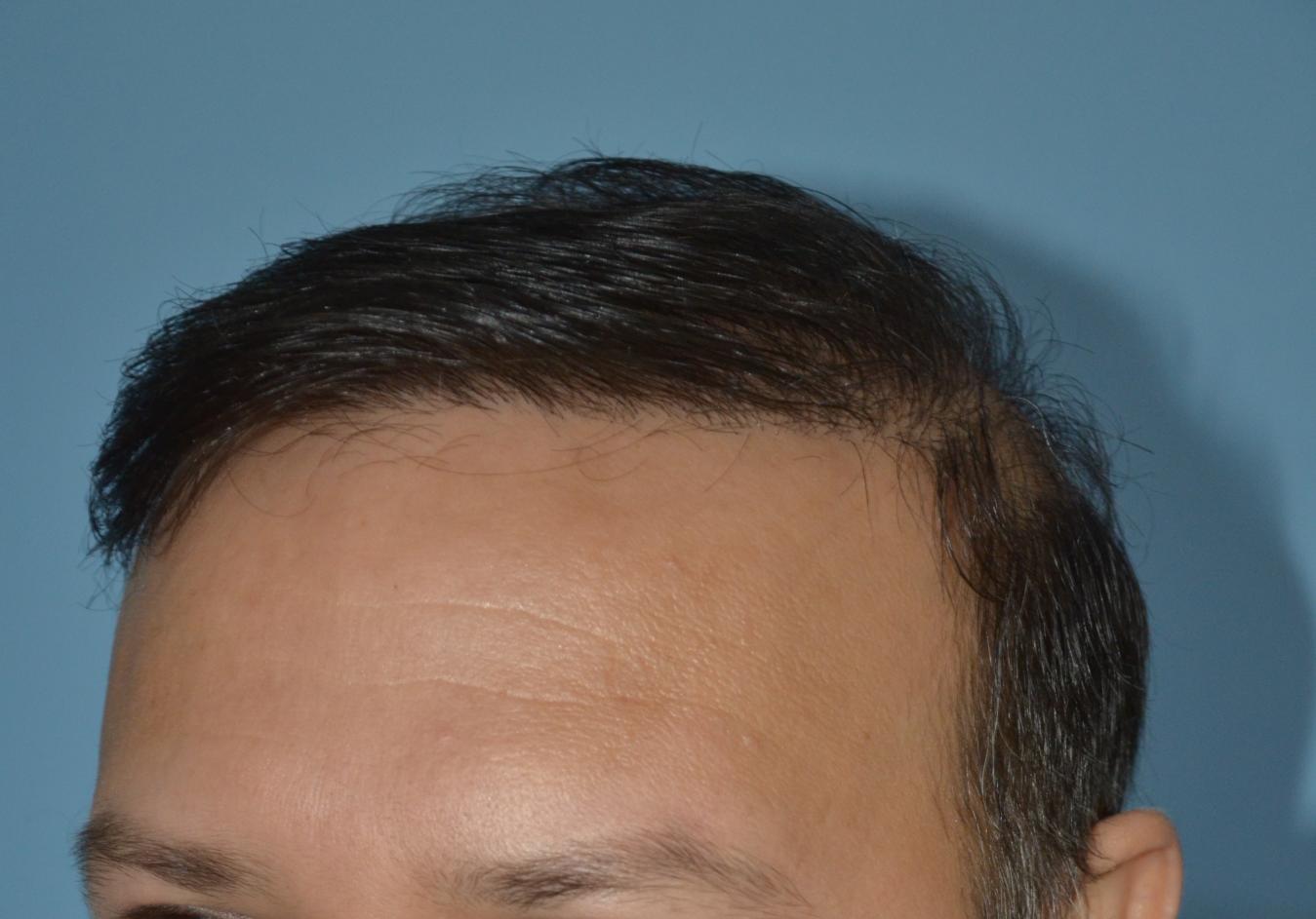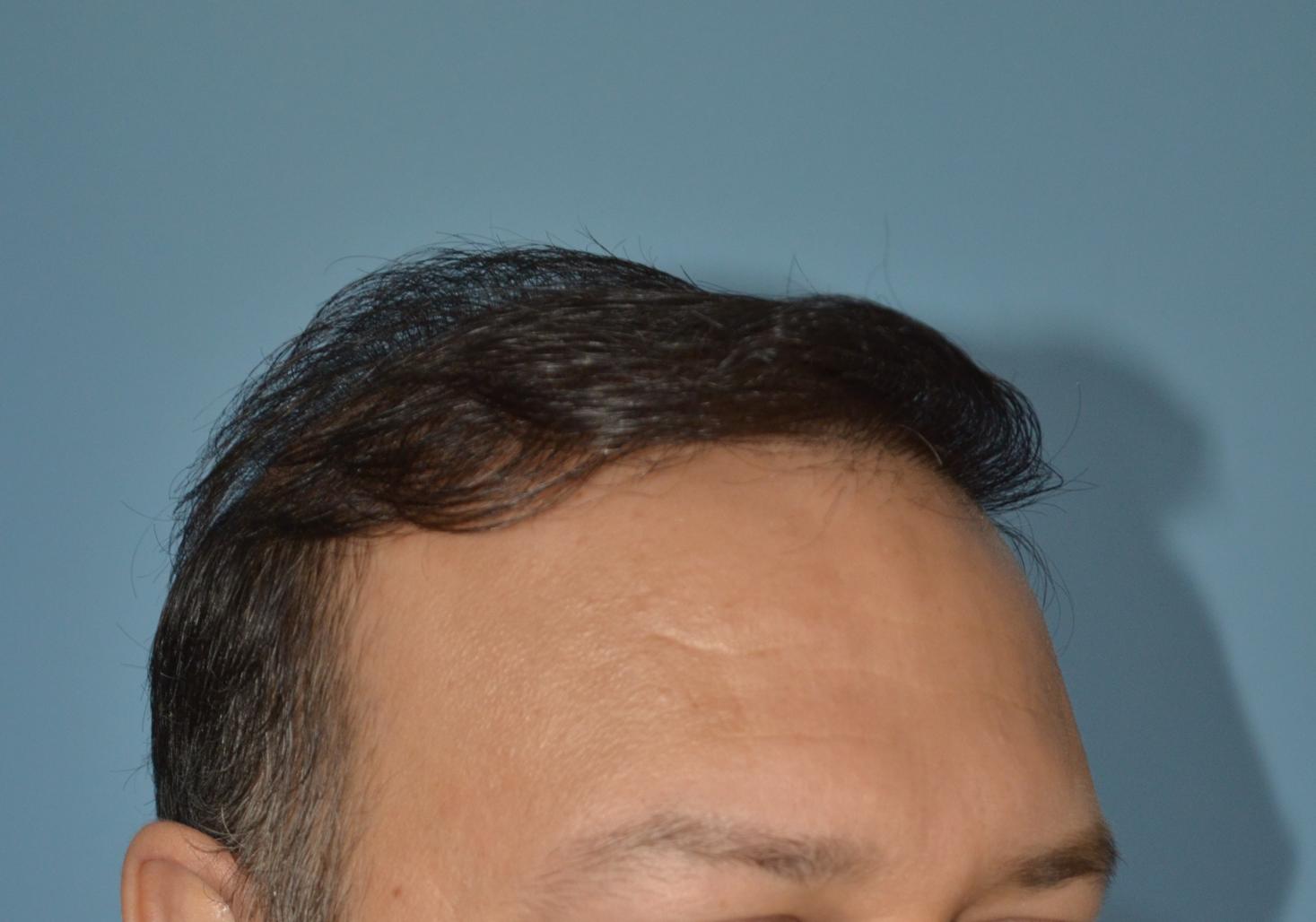 During consultations the patient had inquired about having a lower hairline and adding temple points. Knowing when to avoid temple point work is one of the requirements for good hairline design. Had this hairline been lower he would have a final result that would be similar to that of a hair system as "wigs" can give the appearance of a lower hairline but they cannot replicate the temple points that would normally be found on lower hairlines. Patients like this should consider coverage first and realize that temple points are not only a luxury they should only be created after the rest of the work is done. In the meantime he already looks almost ten years younger because his face is frame in a natural aspect.