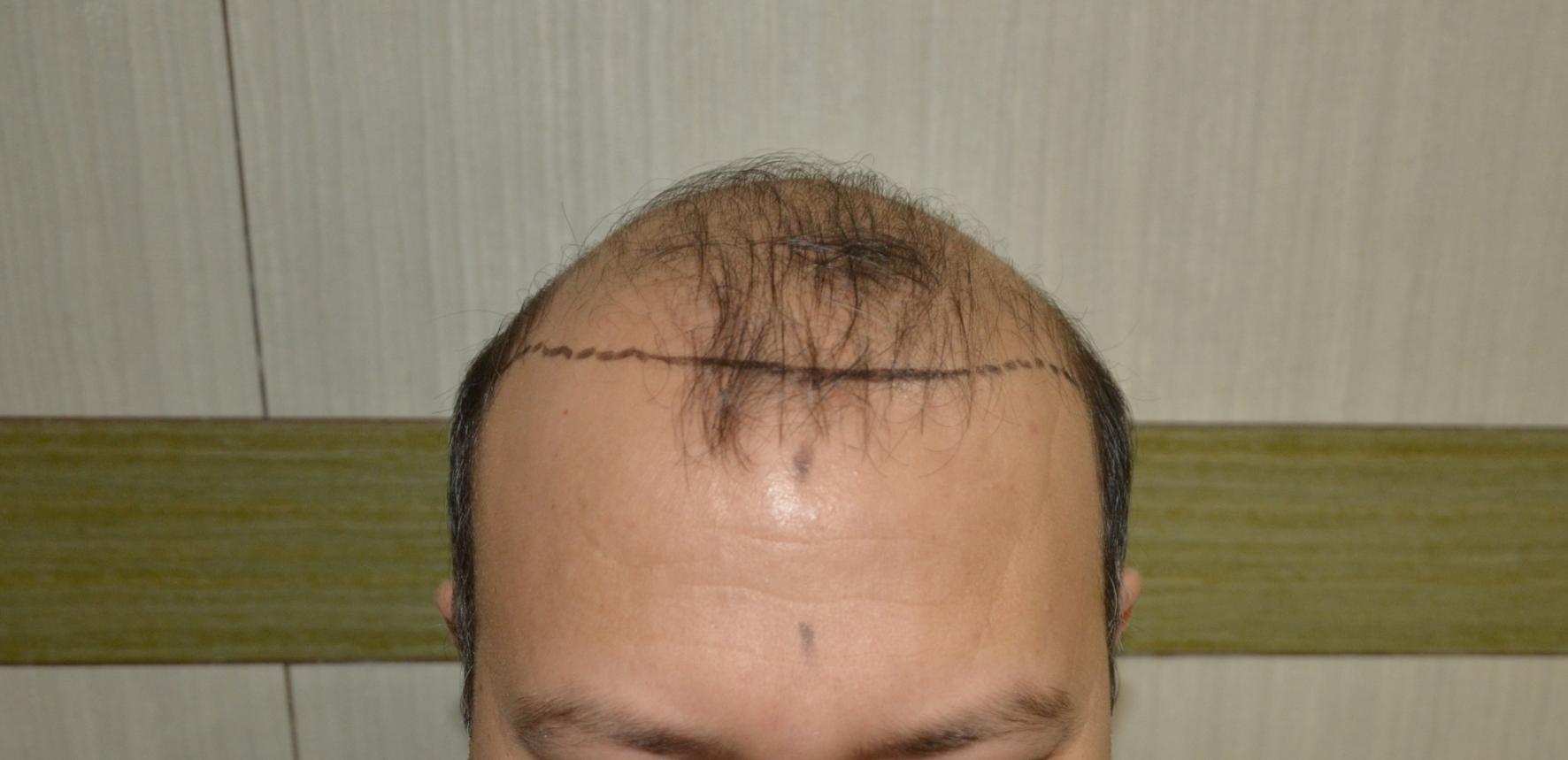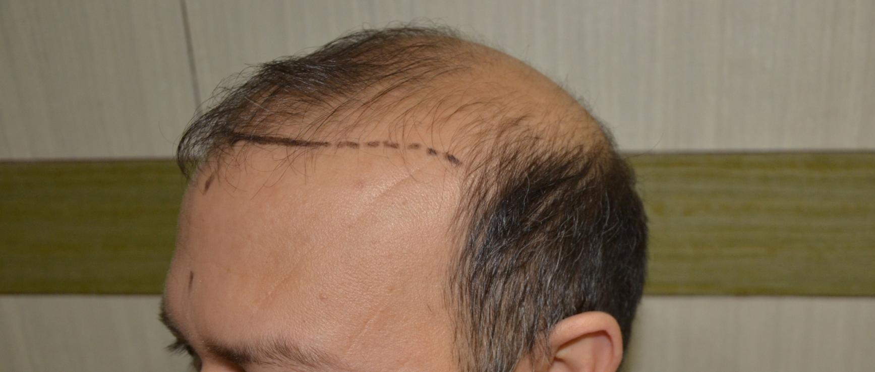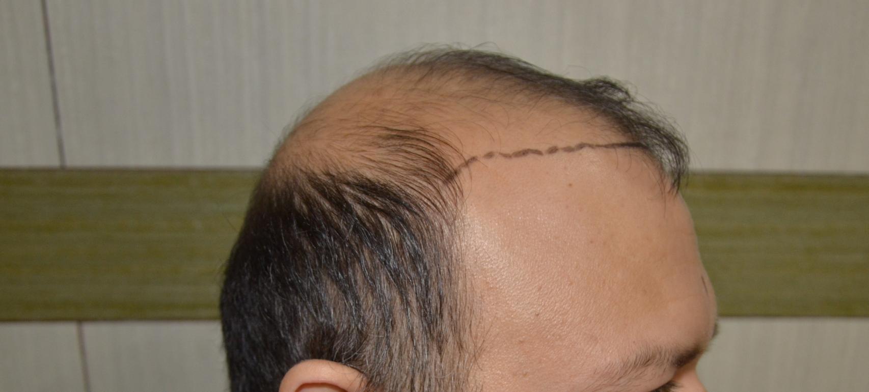 During consultations the patient had inquired about having a lower hairline and adding temple points. Knowing when to avoid temple point work is one of the requirements for good hairline design. Had this hairline been lower he would have a final result that would be similar to that of a hair system as "wigs" can give the appearance of a lower hairline but they cannot replicate the temple points that would normally be found on lower hairlines. Patients like this should consider coverage first and realize that temple points are not only a luxury they should only be created after the rest of the work is done. In the meantime he already looks almost ten years younger because his face is frame in a natural aspect.