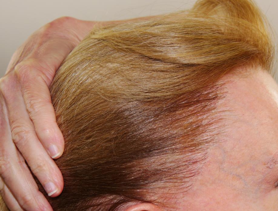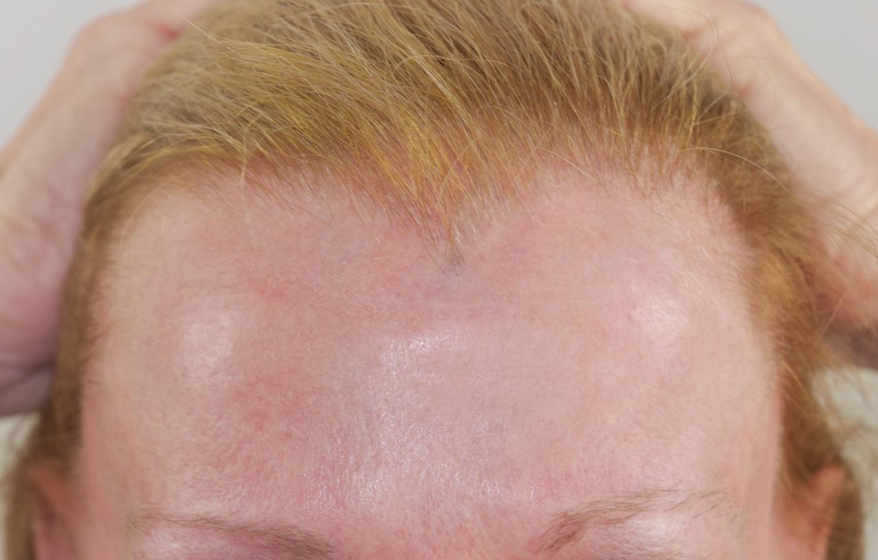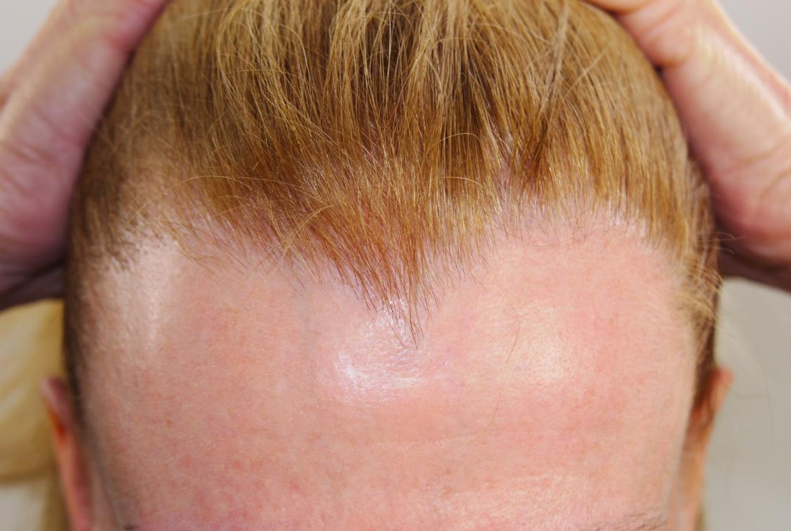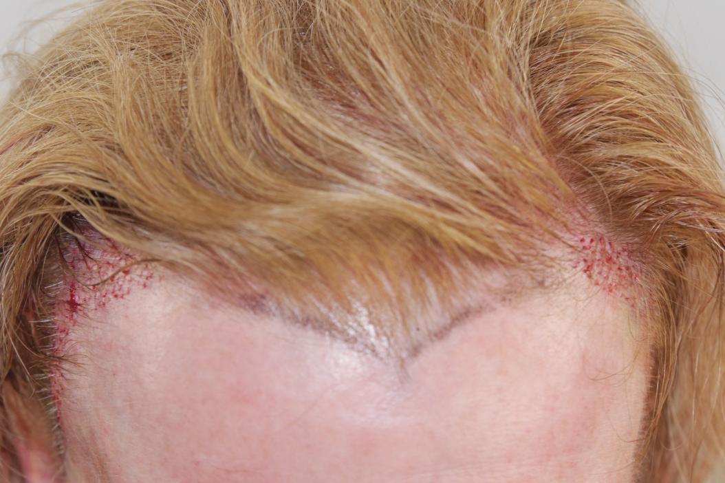 This 57 year old female had 2022 FUT grafts placed in her hairline and temporal areas. The photos show the patient before, immediate post-op, and 1 year post-op. The patient is very pleased with the results of the procedure.