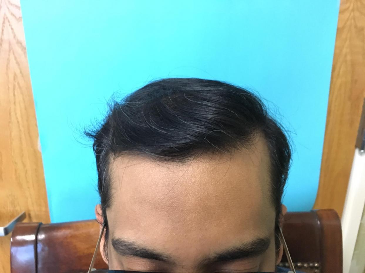 He came in yesterday and is 7 months post-op. He had an FUT procedure with 2688 grafts (575 Single, 1961 Double, and 152 Triple). The patient has been on finasteride to help prevent further loss.