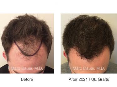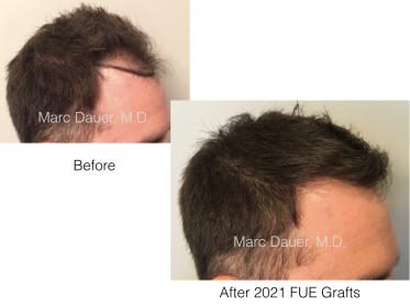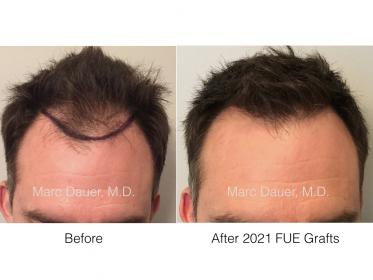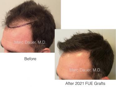 Here is a patient of mine who received 2021 grafts via FUE to the frontal and mid scalp. I extracted every graft personally using a 0.8mm tip. The hairline was created in a conservative location because the patient is 30 years old and predicted to lose a significant amount of additional hair in the future.