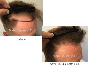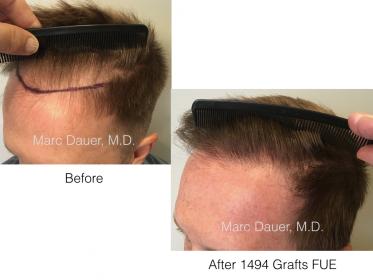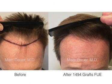 Here is a patient of mine, who is an actor with very fine hair who received 1494 grafts via FUE to the hairline and frontal scalp. The results are shown after 9 months so the patient should see some additional improvement over the next few months, but he is already thrilled with his results.