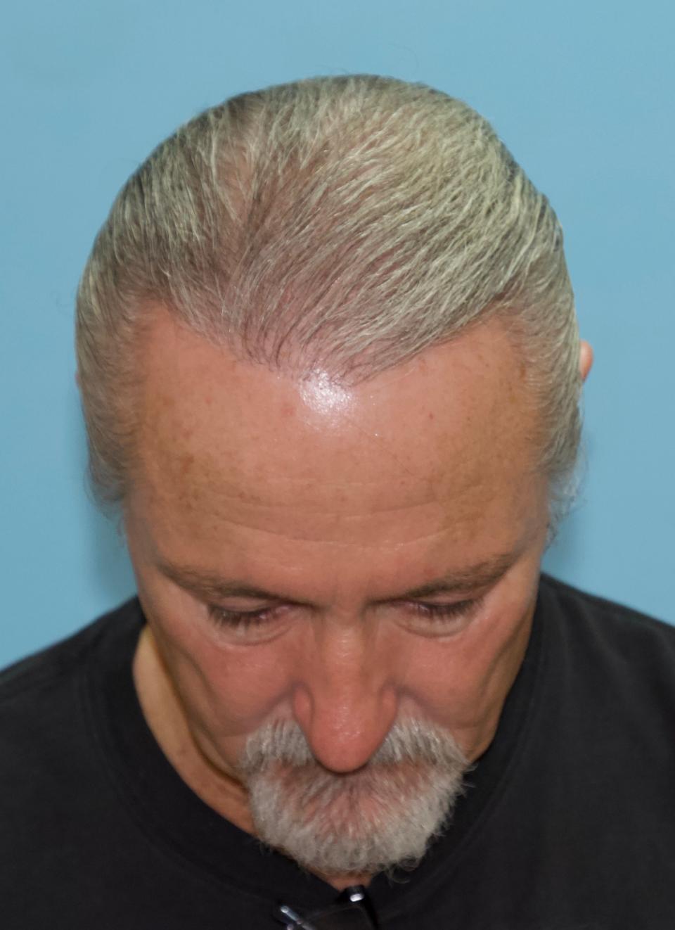 This patient came in today 12 months post-op after receiving 2000 FUE grafts to his frontal forelock and hairline. For gray hair we use hair dye to prevent color bias, and we get the correct proportion of gray and pigmented hair. A 0.80 mm surrounded punch was used for extraction, and grafts were placed using Hans Lion Implanters. All grafts were harvested and placed by Dr. Vories. Full facial images are used with the patient's permission.