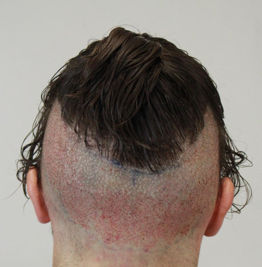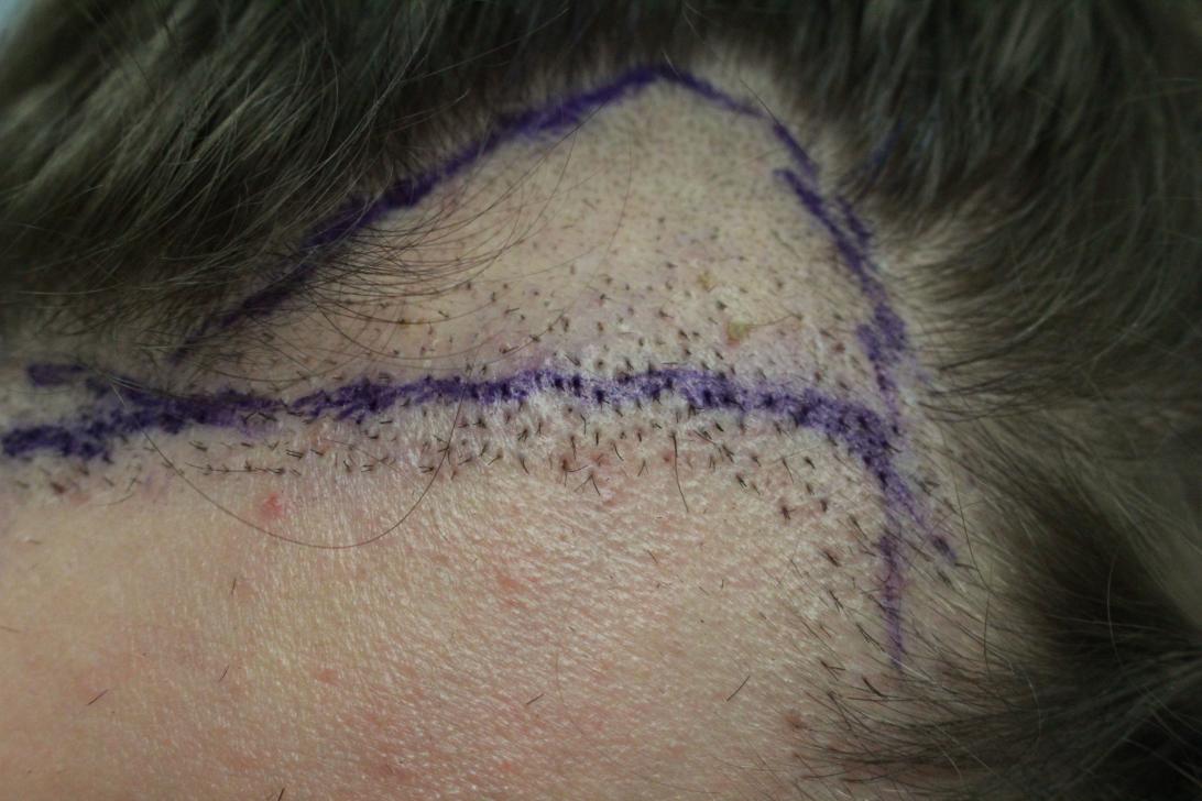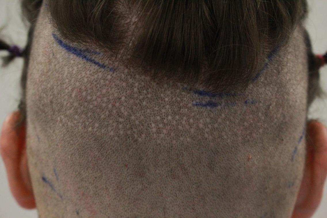 An 8mm punch was used to remove the hairline grafts as well as for the donor extractions. The zone of extractions avoided as much as possible the previous area of large punches to balance out the donor.