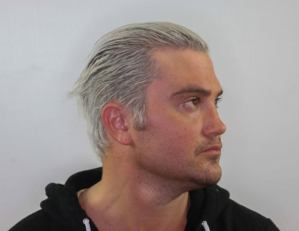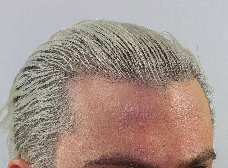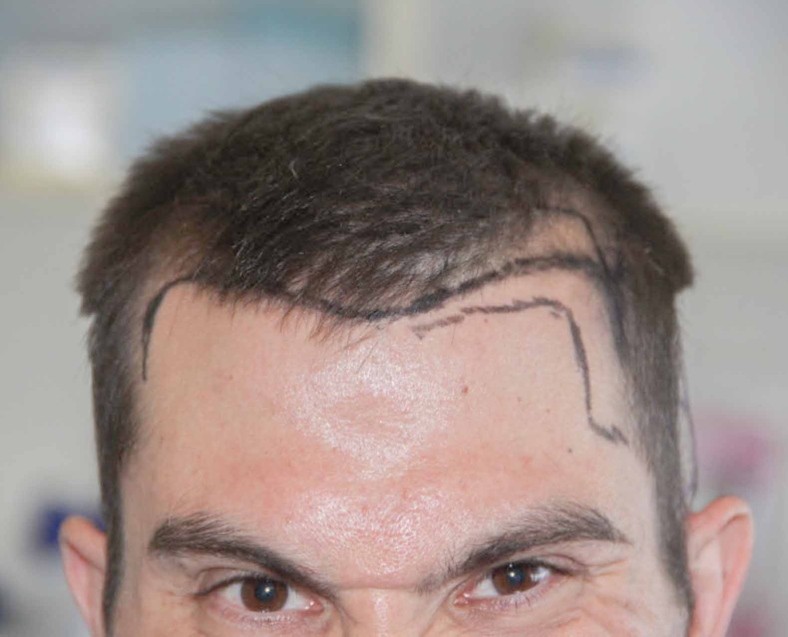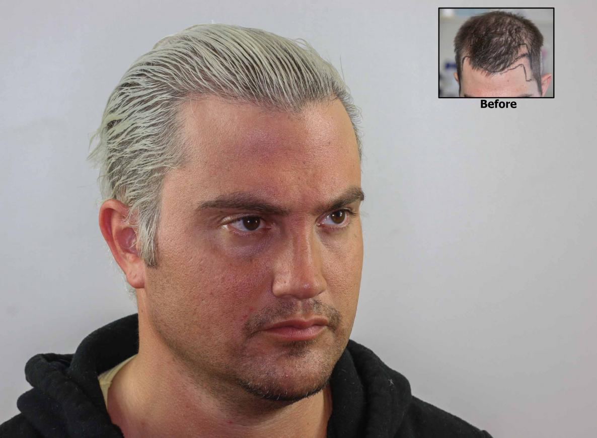 This patient had temple recession and diffuse thinning up the middle. He had an FUE Hair Restoration of 3,527 grafts FUE with Dr. Baubac Hayatdavoudi to lower his hairline, close his temples, enhance temple points to frame his face, and restore his frontal region as well as right up the middle through the mid scalp with grafts placed all in between his existing hairs up the middle.