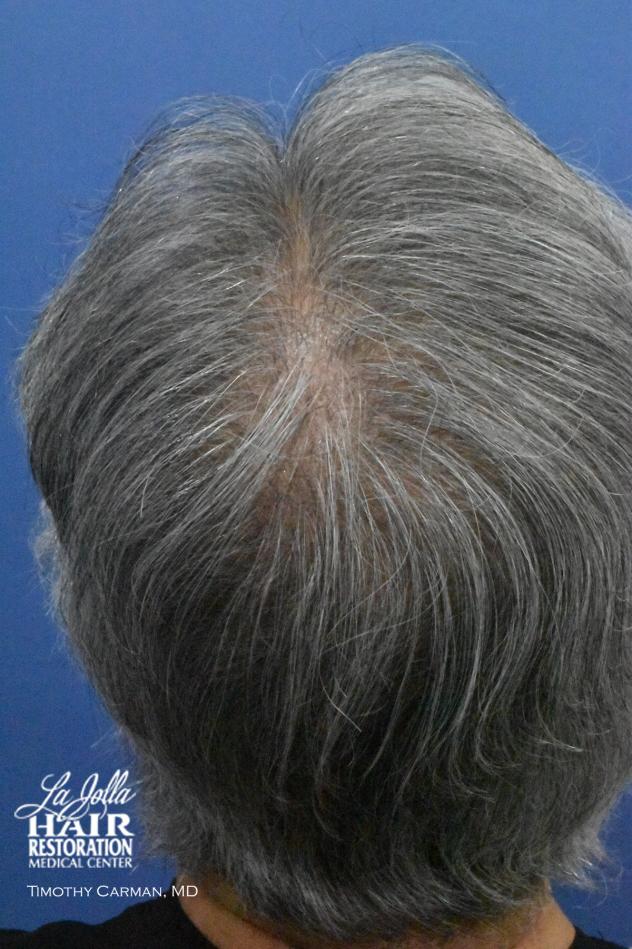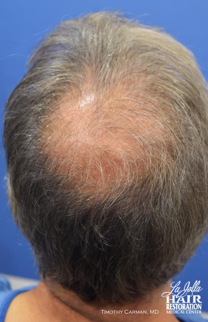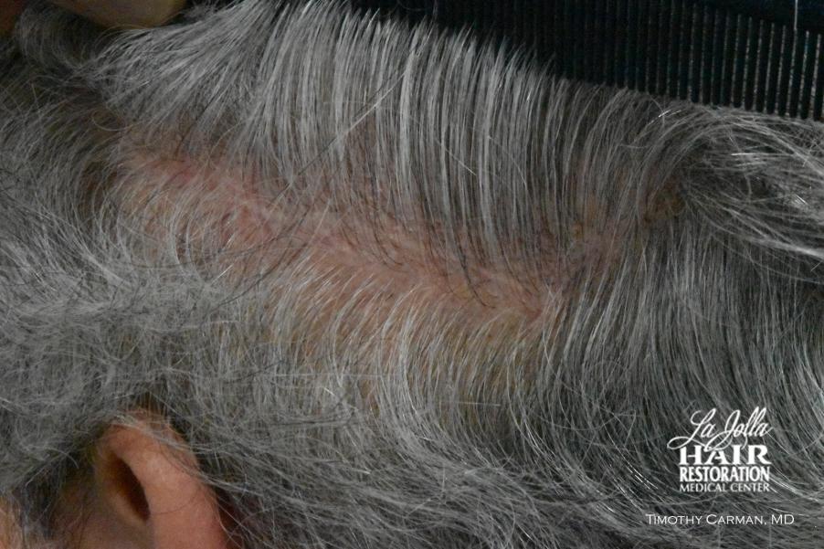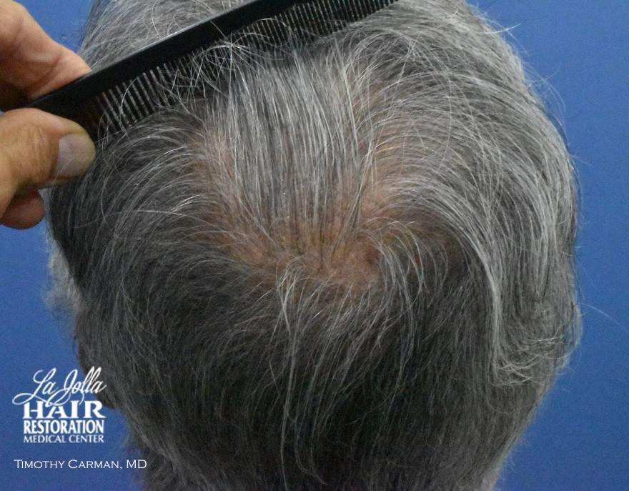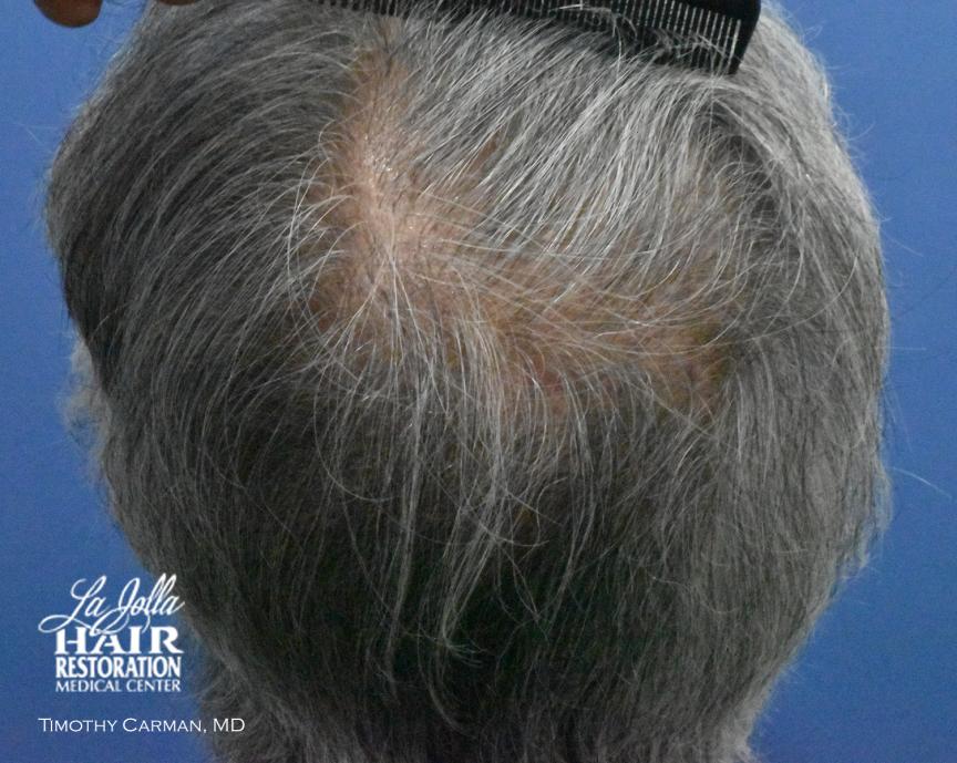 This patient is a 54 YO male who presented with stabilized crown thinning, not on preventative medical therapy. Plan is to reconstruct the crown and add some density to the posterior midscalp. Total FU Grafts: 1576: 285 one's; 954 two's; 337 three's. Last two photos illustrate typical donor closure result utilizing simple plastics closure.