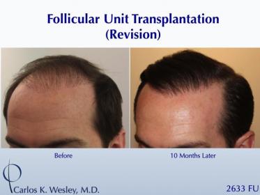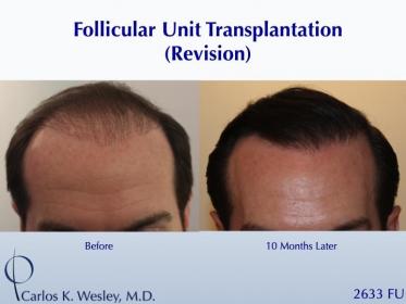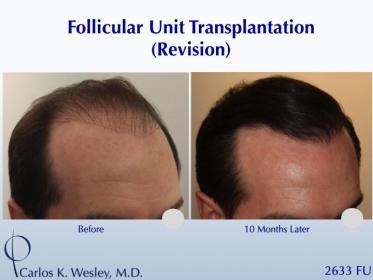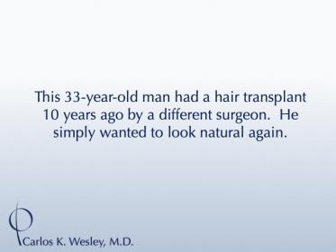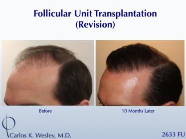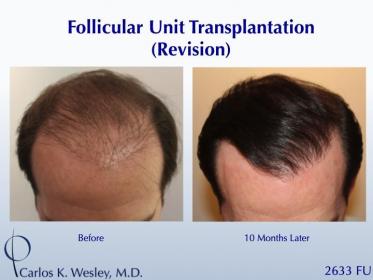 This 33-year-old man underwent a follicular unit transplantation (FUT) session with Dr. Carlos K. Wesley in which a total of 2633 grafts were placed.