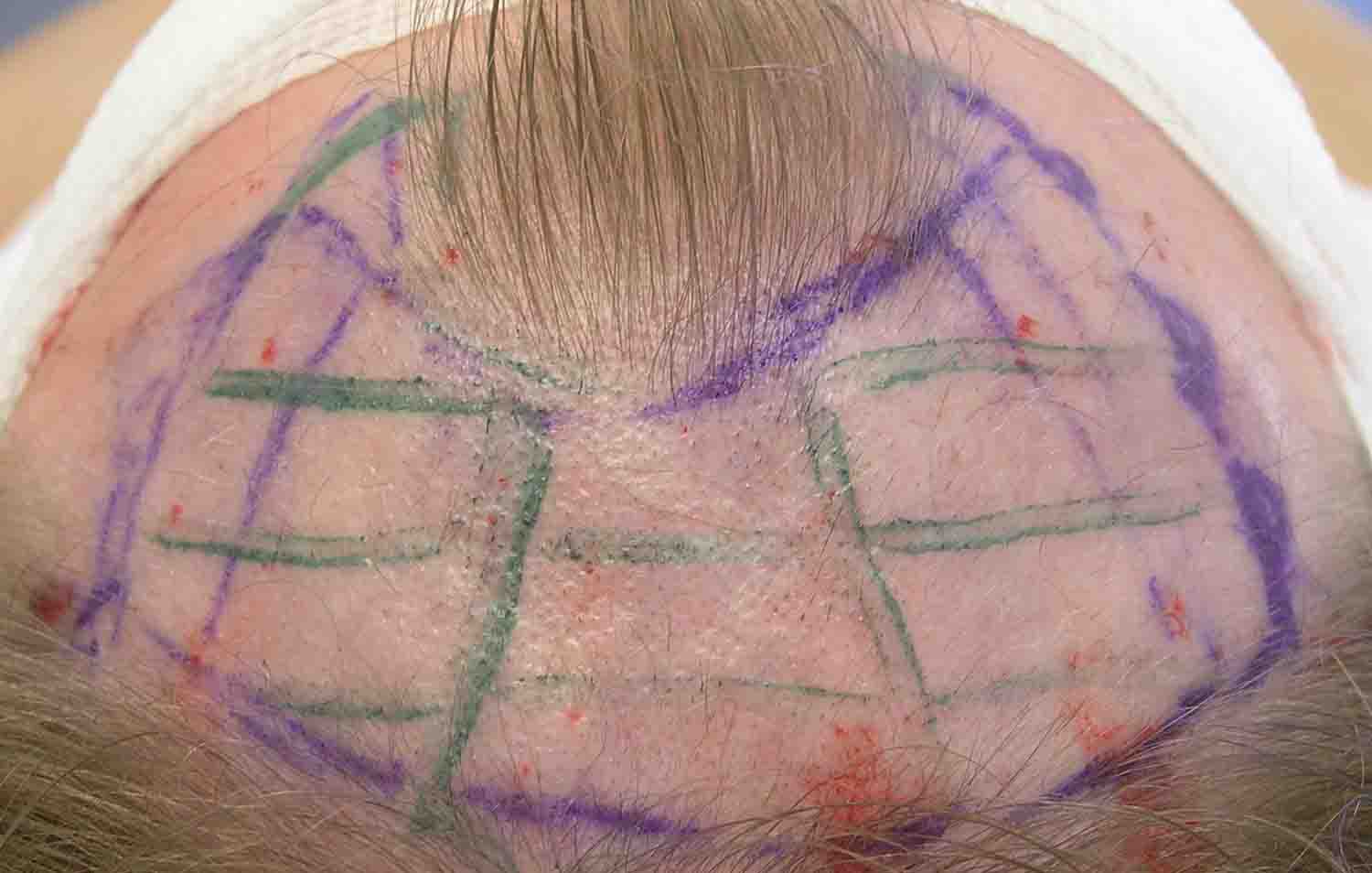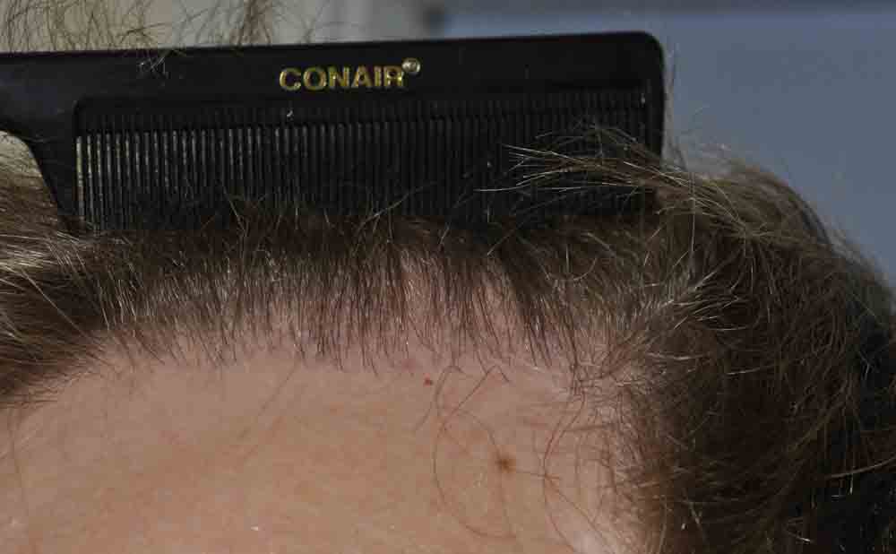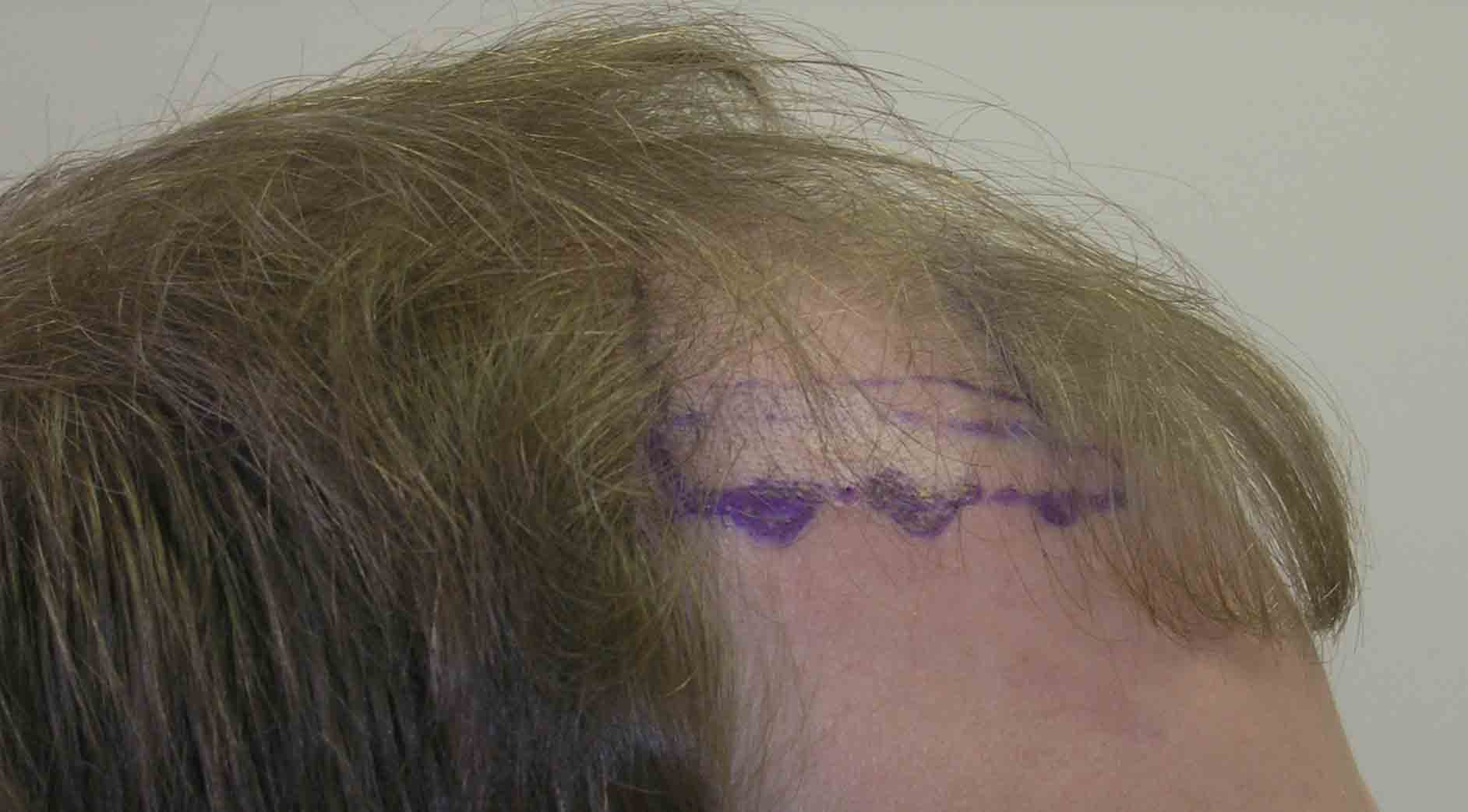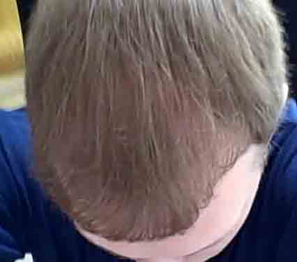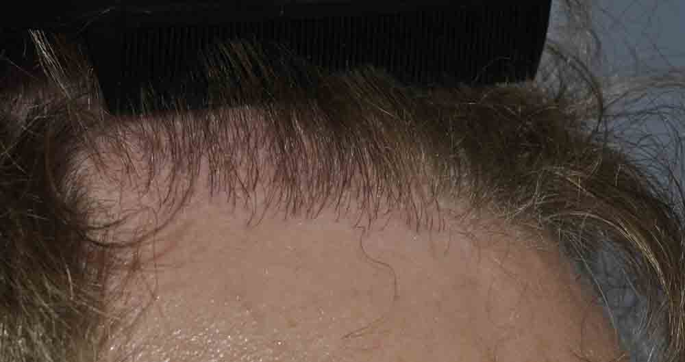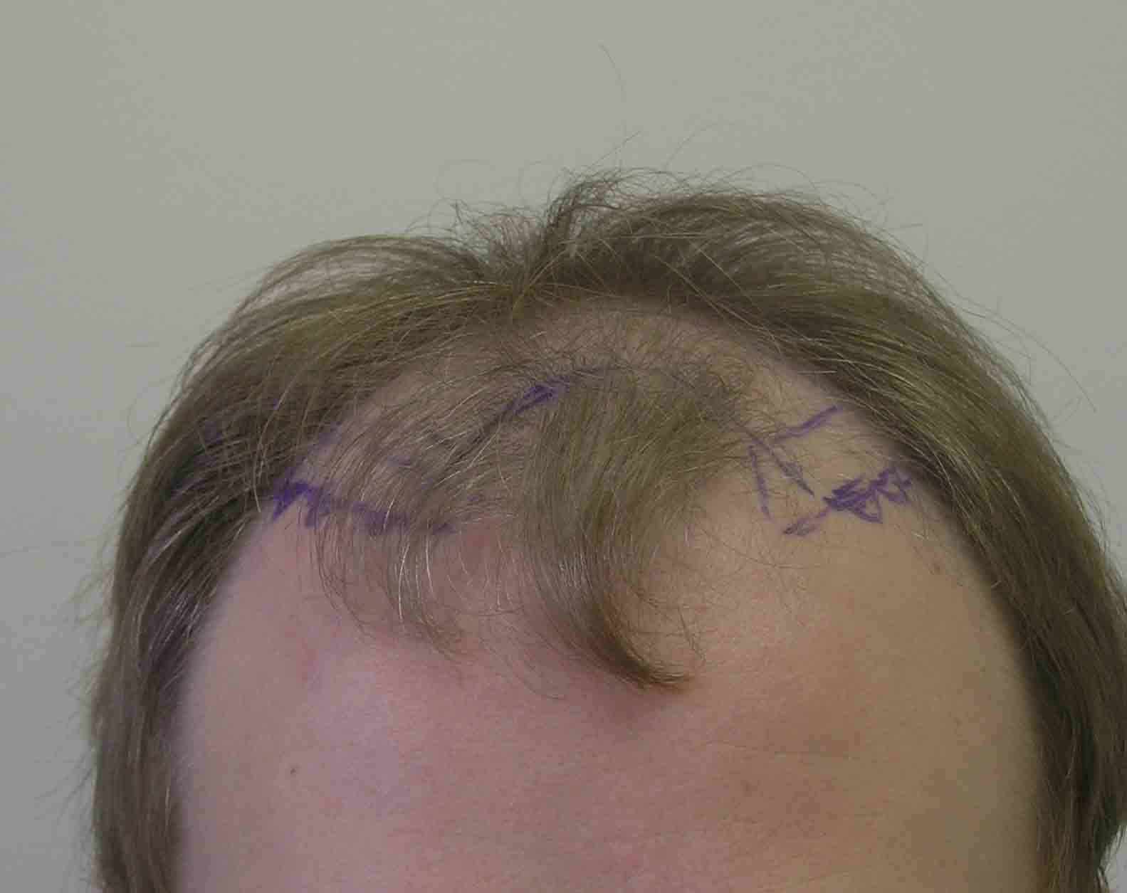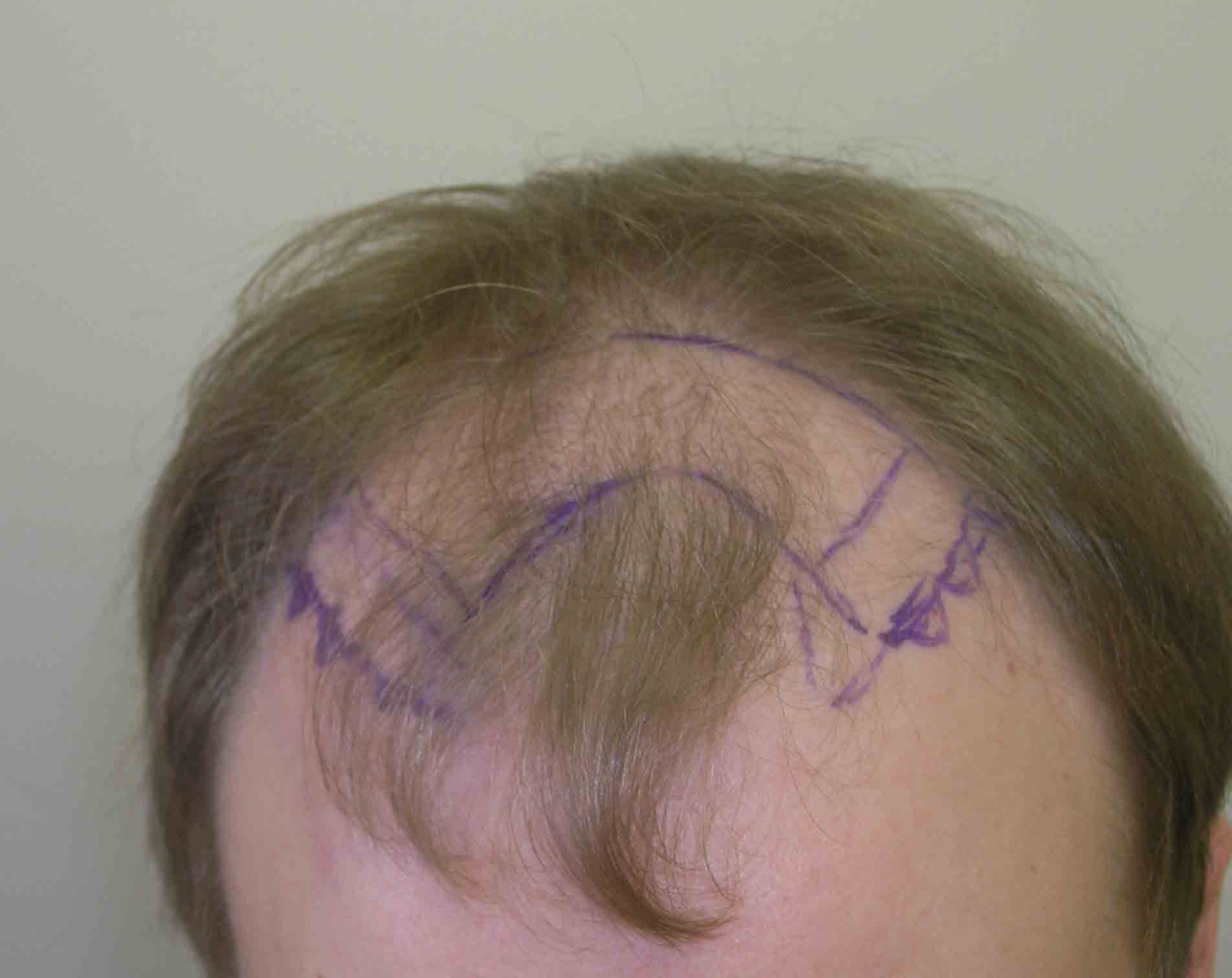 This nice fellow had a nice case last April. He stopped in about 6 months and was growing slowly. At a year, he emailed a pic, included, and was getting better growth. Last Thursday he stopped in as he was passing through Virginia, and at 16 months he looks good. He has had a little more progression of hairloss at the crown side of the "U" and where his triangles join the rest of his hair; and we'll do a small FUE next summer when his job permits.
