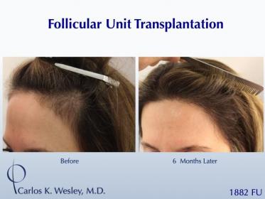 Nine months after attempting a series of 2 platelet rich plasma PRP treatments to fill in her hairline recessions, this 45-year-old woman underwent a follicular unit transplantation FUT session with Dr. Carlos K. Wesley in which a total of 1882 grafts were placed