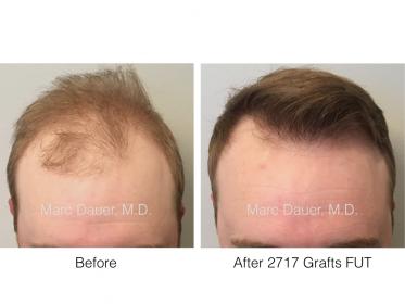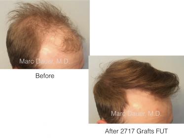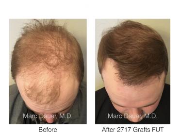 Here is a patient of mine who received 2717 grafts via FUT to the frontal and mid scalp. The patient was only 29 when he had his hair transplant (his first), so we opted for a very conservative hairline taking into account that he will have significantly more loss over the coming years.
