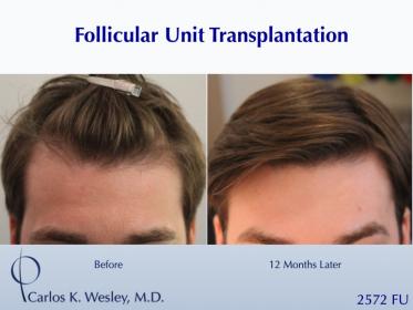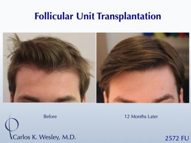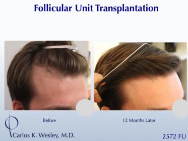 This patient underwent a follicular unit transplantation (FUT) session with Dr. Carlos K. Wesley in which a total of 2572 grafts were placed