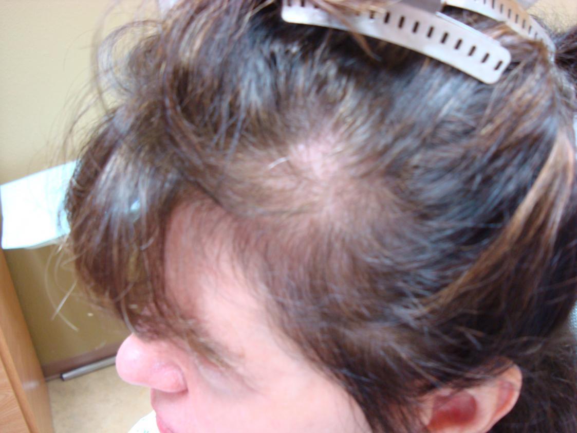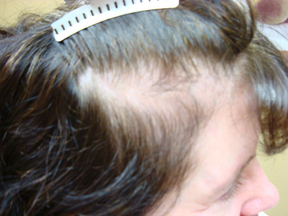 This very nice woman came to our office with diffuse hair loss at both temporal areas. The origin of her hair loss is unknown, but most likely genetic. It was not traction alopecia.