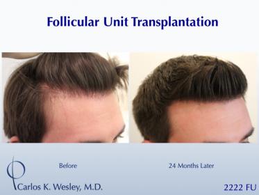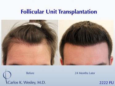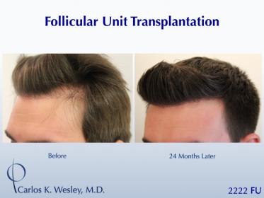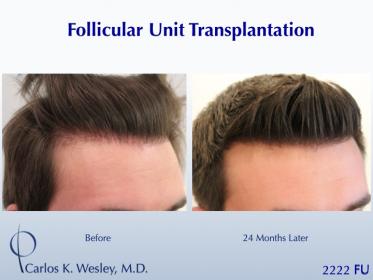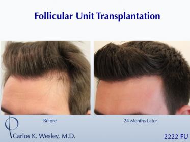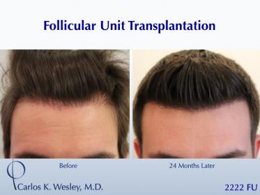 This patient man underwent a follicular unit transplantation (FUT) session with Dr. Carlos K. Wesley in which a total of 2222 grafts were placed.