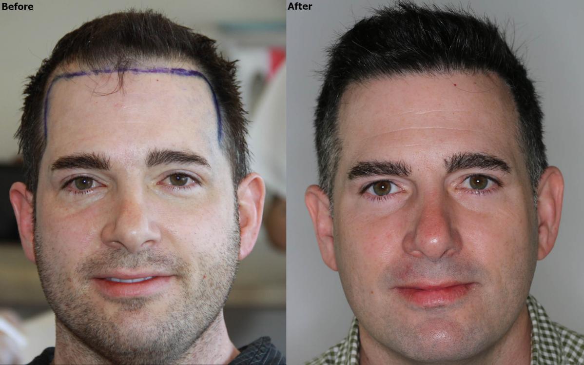 The patient below had 3,081 grafts Fue with Dr. Baubac in our Beverly Hulls clinic to restore zones 1 and 2, to recreate and lower his hairline, close in the temples to reframe the patient's face for a younger and more enhanced look.