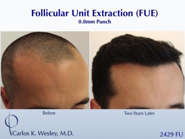 This patient underwent a follicular unit extraction (FUE) session with Dr. Carlos K. Wesley in which a total of 2429 grafts were placed