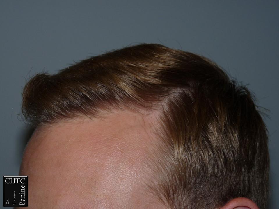 This 27-year-old gentleman had a hair loss pattern similar to a class 3 on the Hamilton Norwood hair loss scale. His goal was to rebuild his hairline and add density to the frontal 1/3-1/2 of his scalp. Taking his age and hair loss into consideration we came upon an agreement for what would suite his expectations. After establishing his medical history and understanding the progression of his hair loss, I diagnosed his condition as Androgenetic Alopecia (male pattern baldness), ruling out any other possible dermatological or medical conditions which can cause hair loss. The patient’s goal was well suited to his needs and therefore I planned the surgery accordingly. I wanted to reconstruct a hairline that would be suitable for him as he continued to age. A total of 2,166 grafts were used. I used a significant amount of single hair follicular units which allowed me to create a very natural hairline. This action will allow him to comb his hair without anyone detecting that he has had anything done. These are his results 14 months post-op. The patient is extremely happy with his results and is on Finasteride to try and control further hair loss.