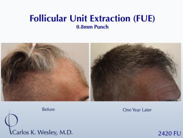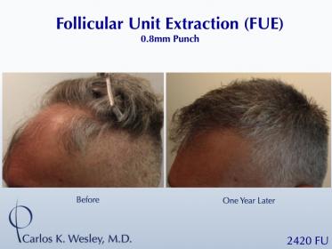 This patient underwent a follicular unit extraction (FUE) session with Dr. Carlos K. Wesley in which a total of 2420 grafts were placed