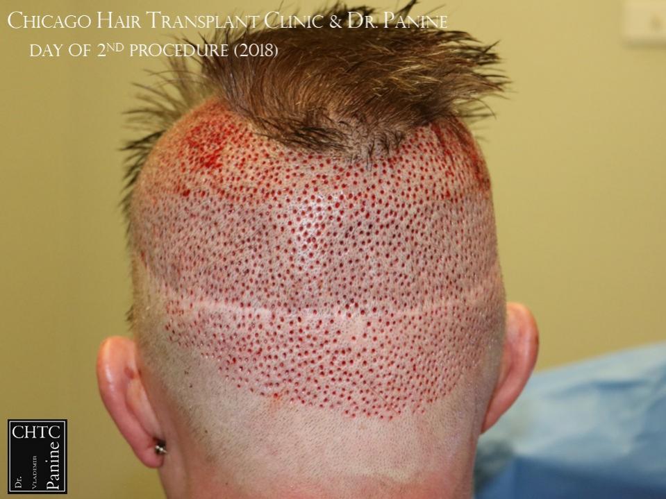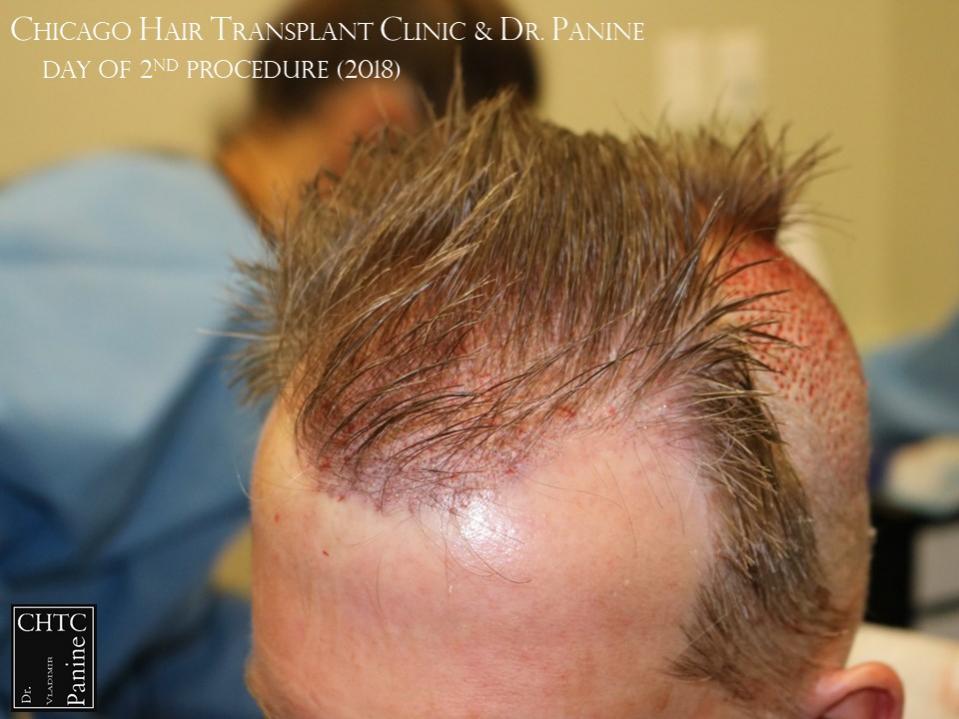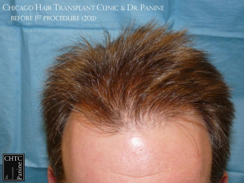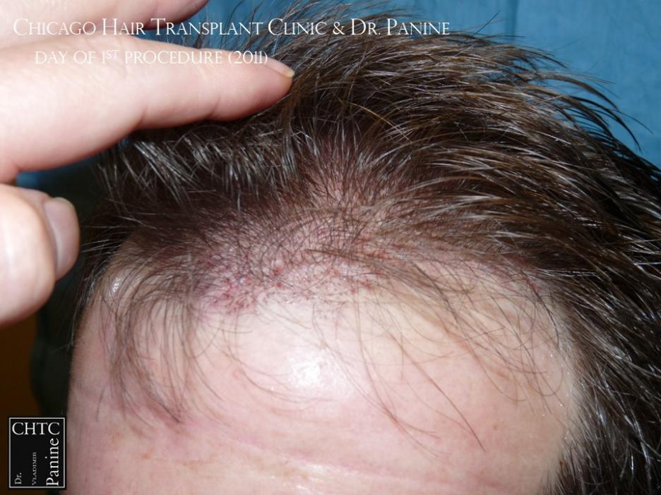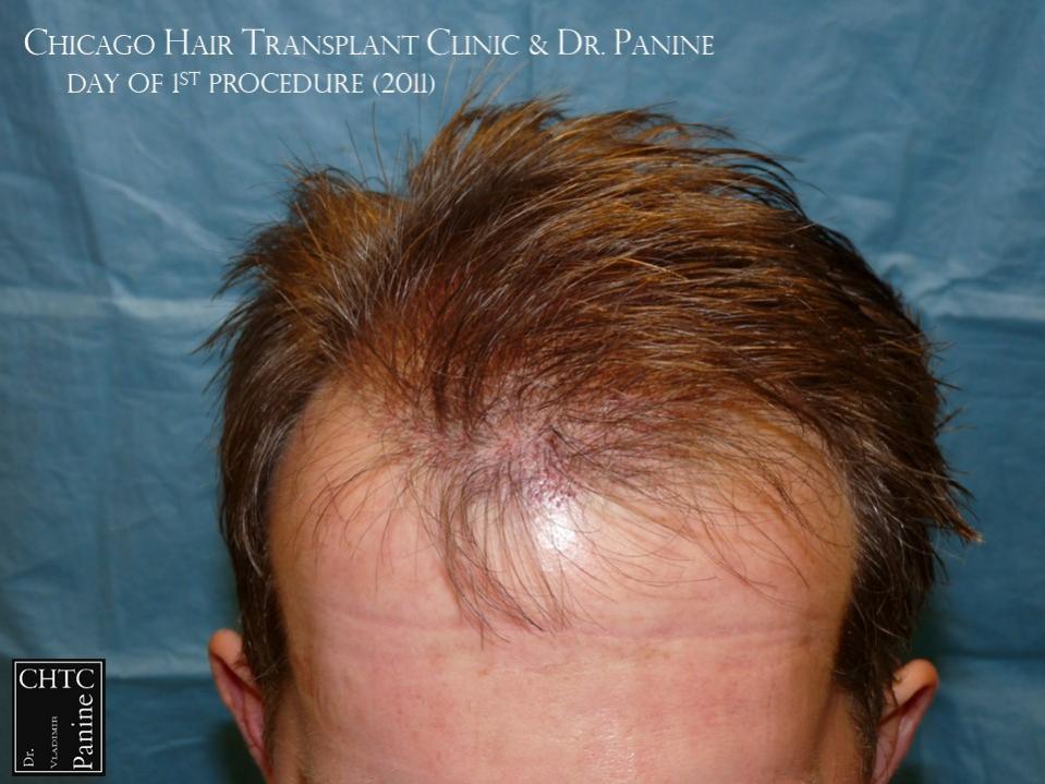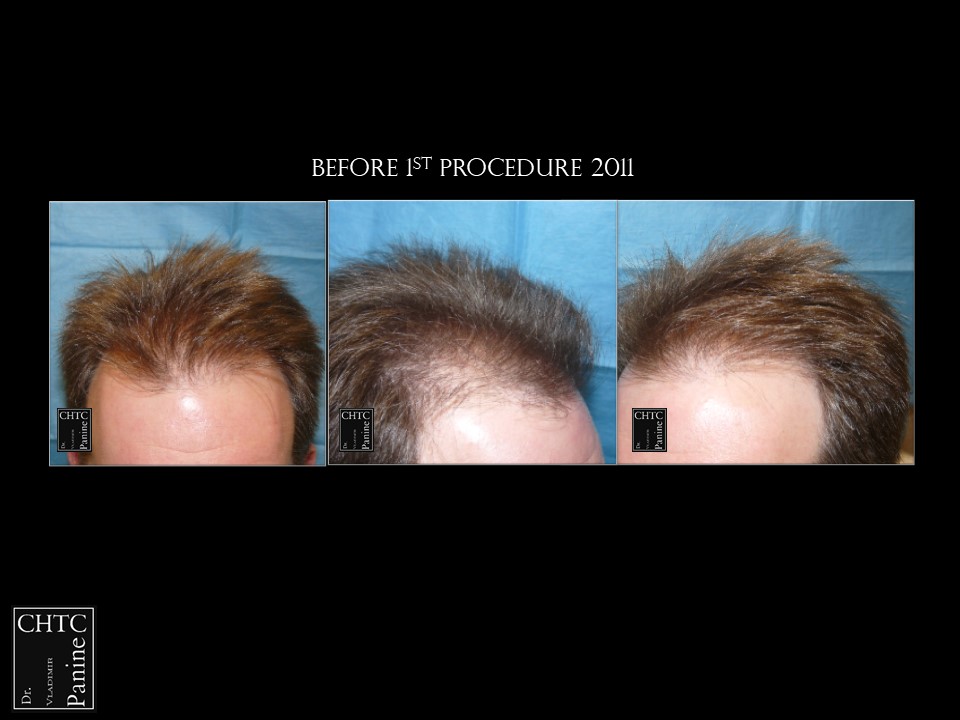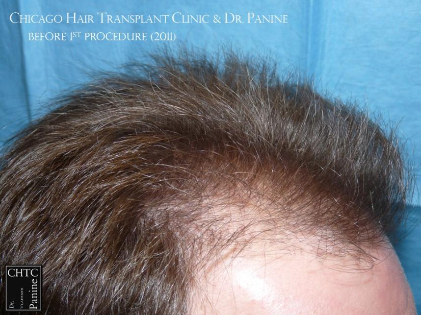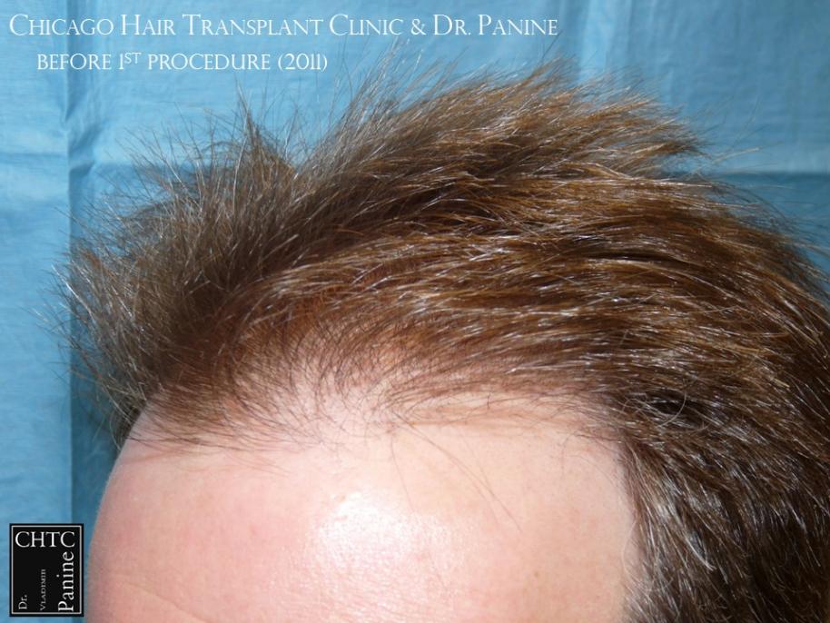 Back in 2011 this patient came to see me looking to have a hair transplant. At that time, he was similar to a class 3 on the Hamilton Norwood hair loss scale. His goal was to rebuild his hairline and add density to the frontal 1/3 of his scalp. Taking his age and hair loss into consideration we came upon an agreement for what would match his expectations. After establishing his medical history and understanding the progression of his hair loss, I diagnosed his condition as Androgenetic Alopecia (male pattern baldness), ruling out any other possible dermatological or medical conditions which can cause hair loss. The patient’s goal was well suited to his needs and therefore I planned the surgery accordingly. At that time, I did 2,105 grafts with a FUT surgery.
