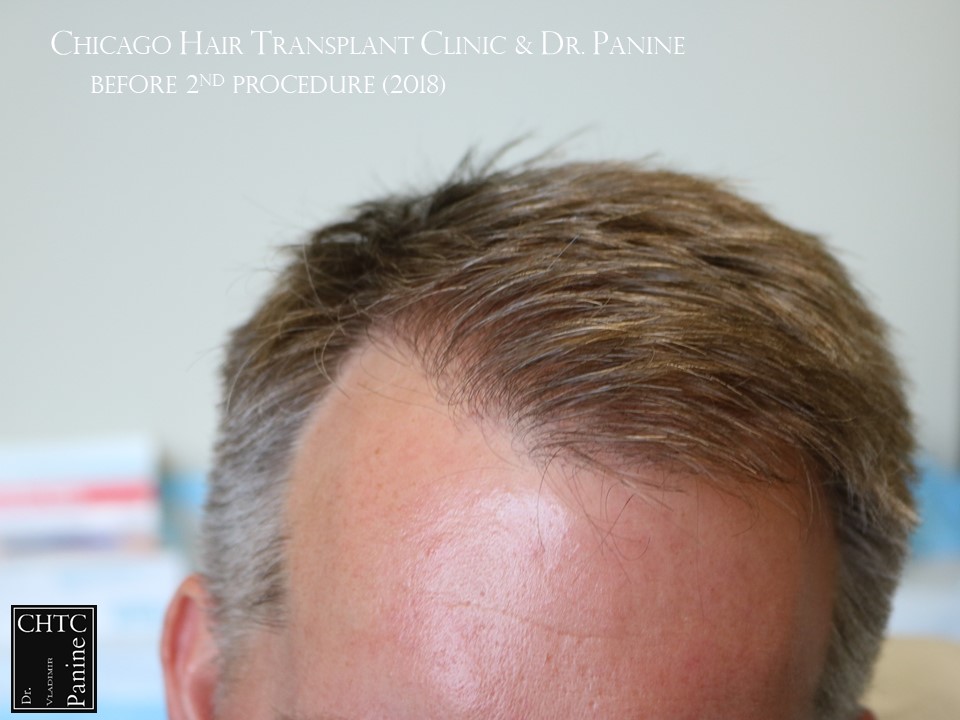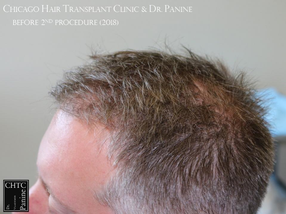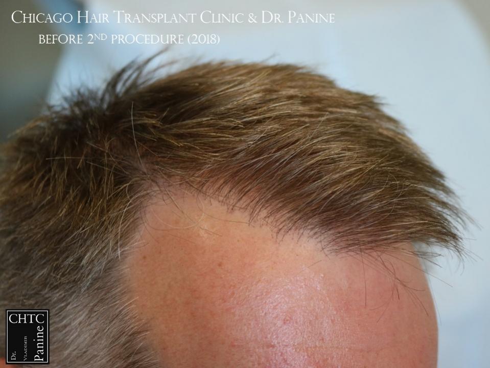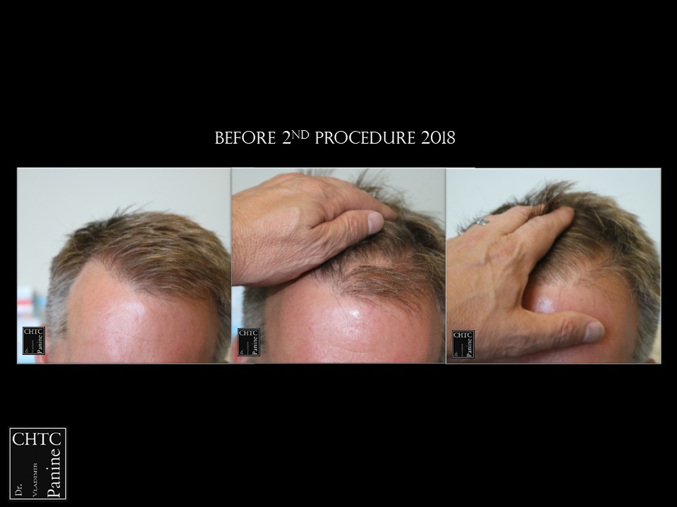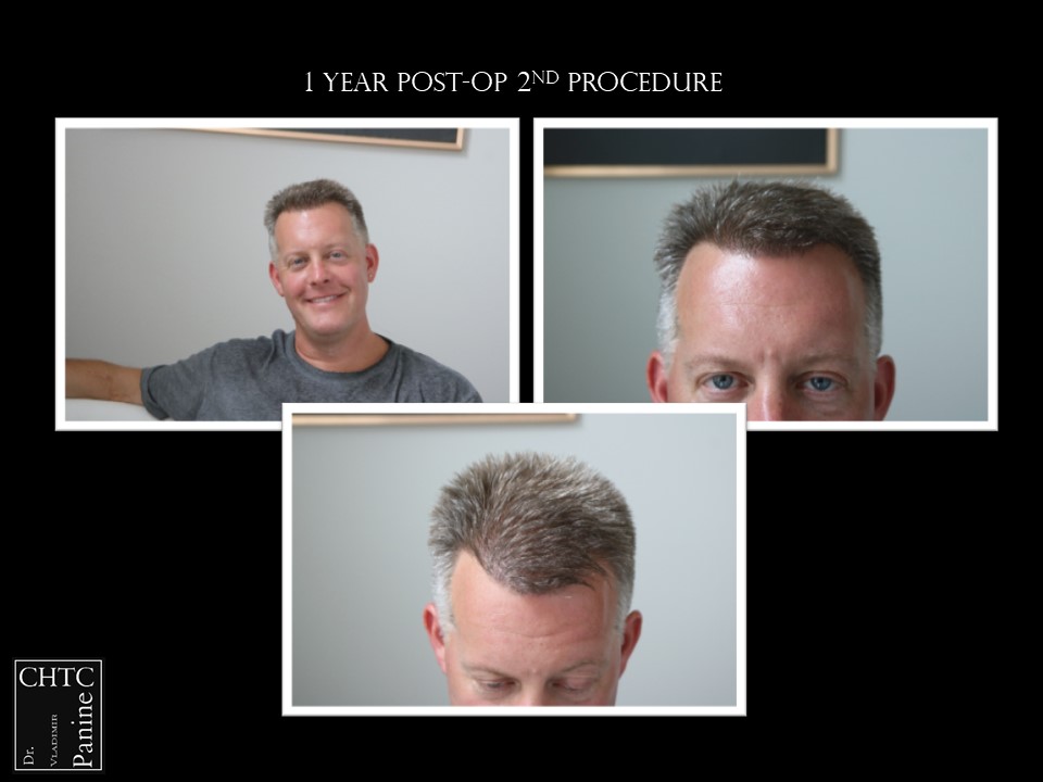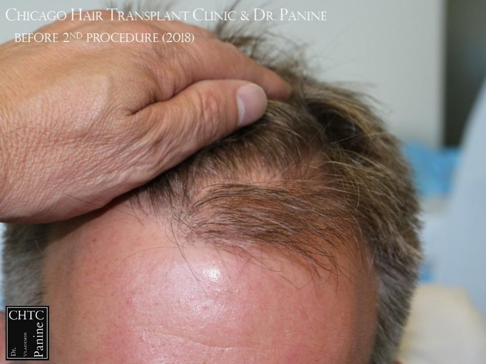 He returned to see me in 2018 for a second surgery. At that time, his hair had slightly thinned over the last 7 years and was looking for more density. I determined it would be better to have a FUE procedure this time. He wanted to move forward and therefore we proceeded, augmenting his hairline and adding more density to the frontal ½ of his scalp with 2,505 FUE grafts. The photos presented are a series of pictures spanning from prior to his 1st procedure to 1-year post-op after his 2nd procedure.