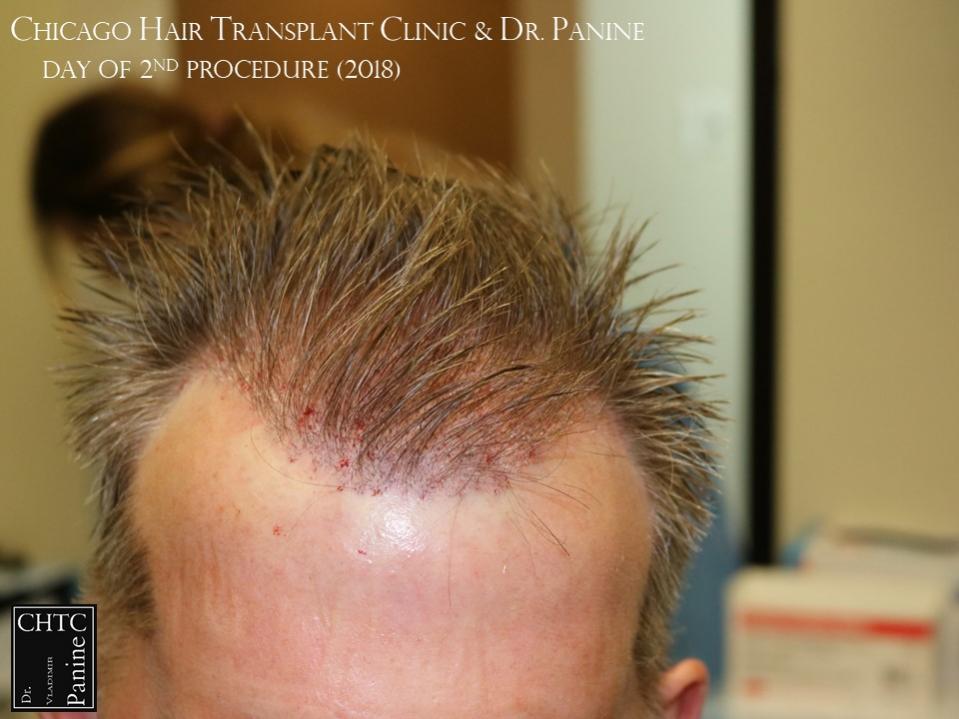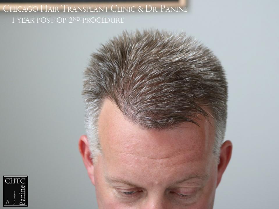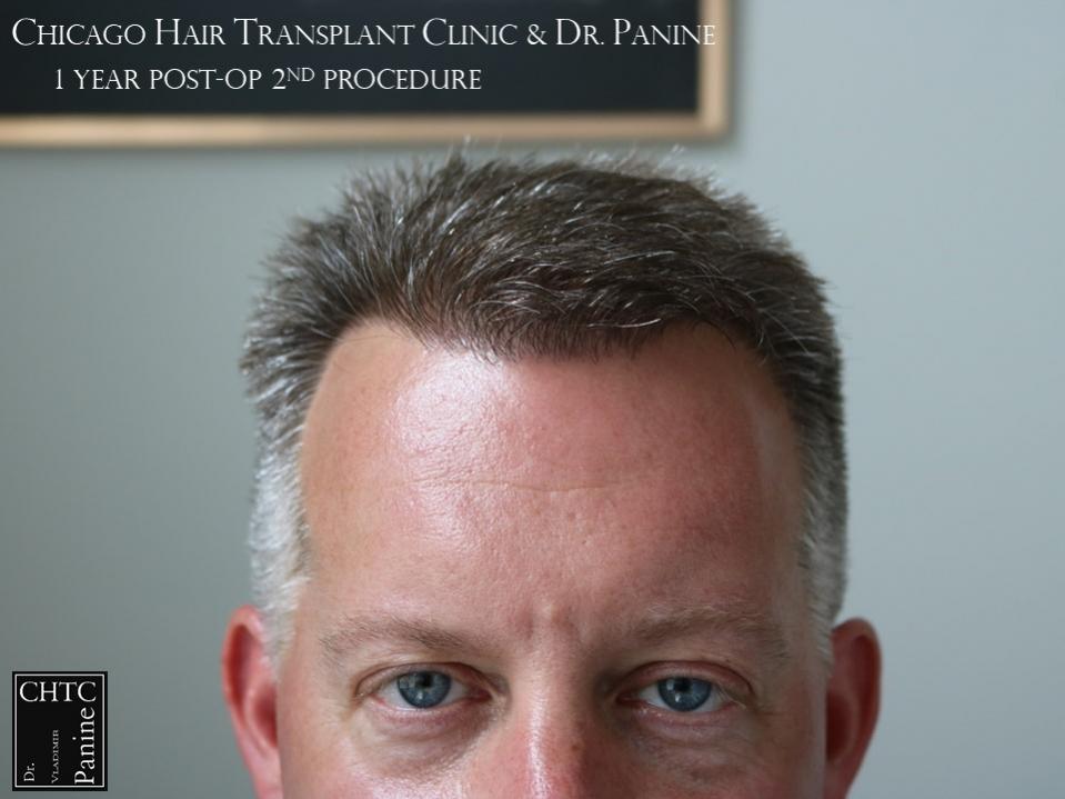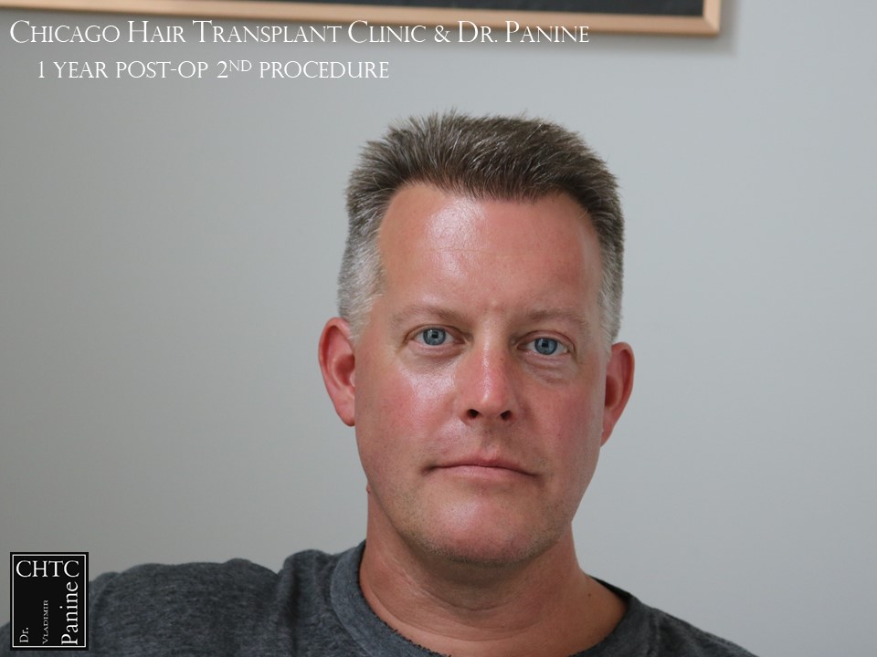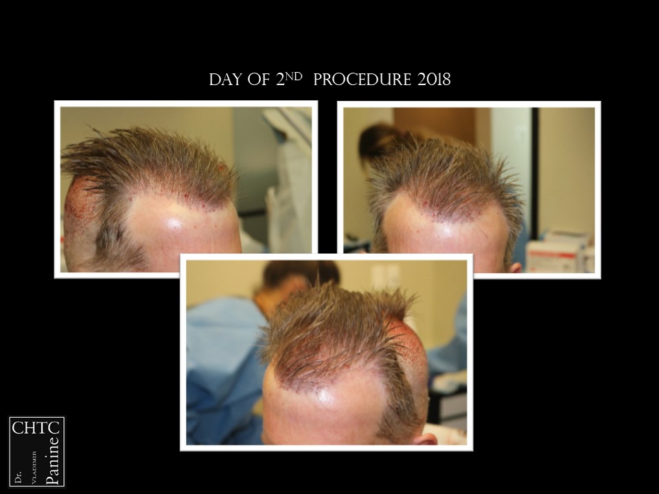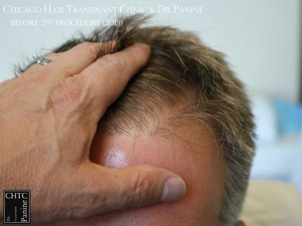He returned to see me in 2018 for a second surgery. At that time, his hair had slightly thinned over the last 7 years and was looking for more density. I determined it would be better to have a FUE procedure this time. He wanted to move forward and therefore we proceeded, augmenting his hairline and adding more density to the frontal ½ of his scalp with 2,505 FUE grafts. The photos presented are a series of pictures spanning from prior to his 1st procedure to 1-year post-op after his 2nd procedure.