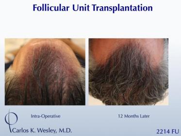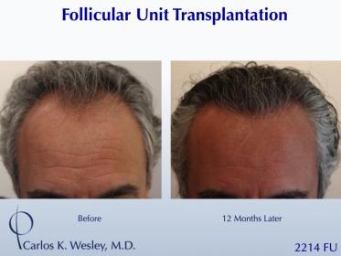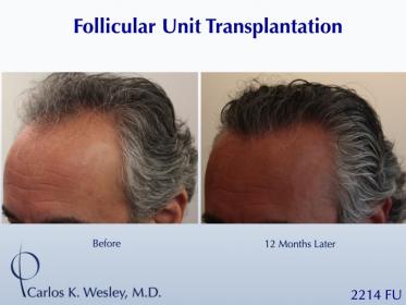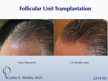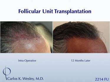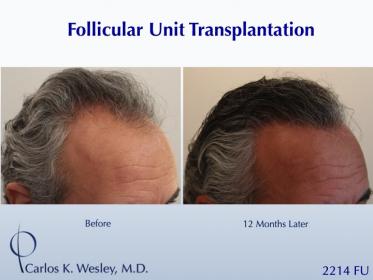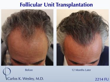 This patient underwent a follicular unit transplant (FUT) session with Dr. Carlos K. Wesley in which a total of 2214 grafts were placed