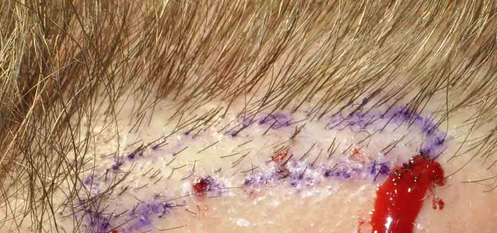 This fellow had several previous surgeries at a nearby facility with a combination of minigrafts and strip surgeries. His main complaint was that his scar was visible after haircuts or when the hair was wet.