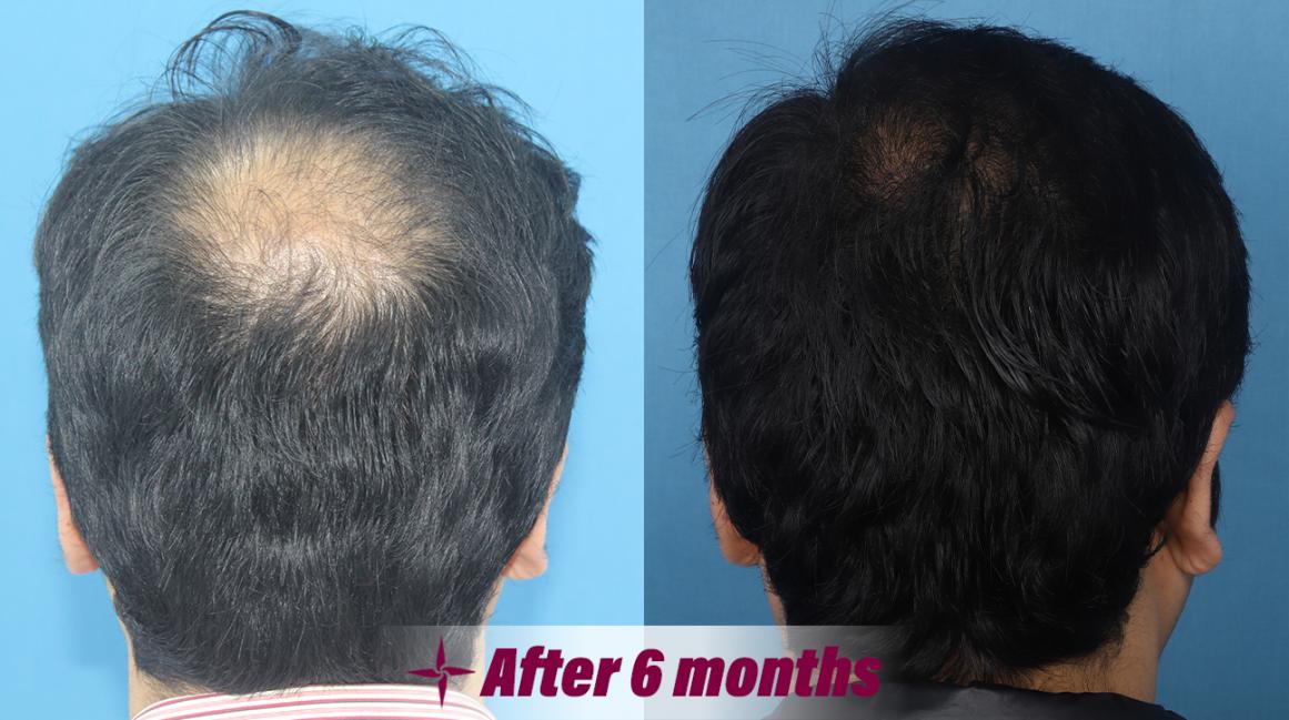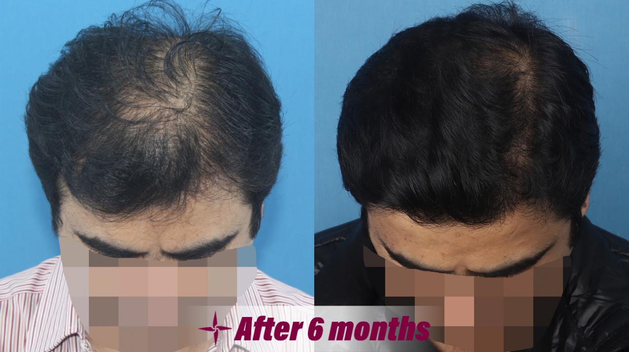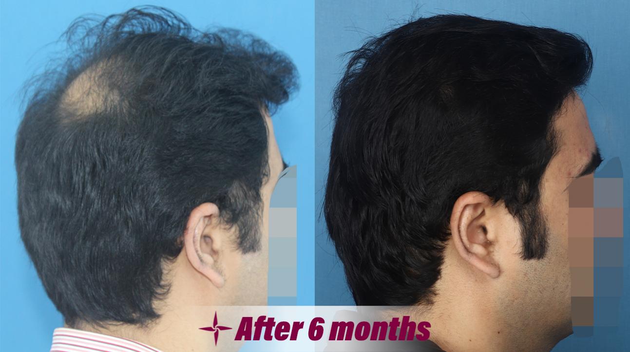 Above we have exhibited his results after 6 months in which you can witness the complete change in look and the great density that he has achieved. You can also see his results after a duration of 3 months where he had already started to experience the start of his hair growth. He is also taking medications to preserve his pre-existing hair.
