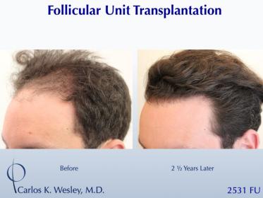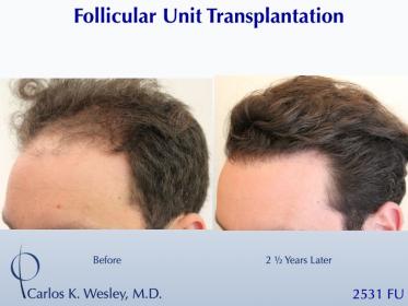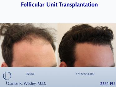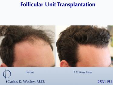 This patient underwent a follicular unit transplantation (FUT) session with Dr. Carlos K. Wesley in which a total of 2531 grafts were placed