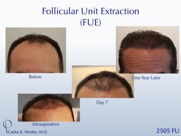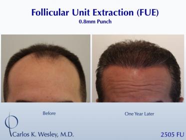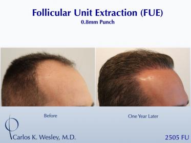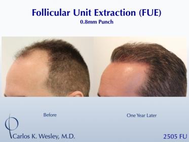 This 45-year-old man underwent a Follicular Unit Extraction (FUE) session with Dr. Carlos K. Wesley in which a total of 2505 grafts were placed. The recovery can be seen through images before, during, one week postop, and one year later.