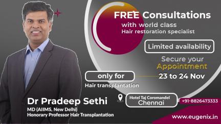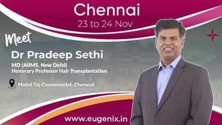 Eugenix*Hair Sciences is extremely pleased to announce that Dr Pradeep Sethi with his team, is going to be available in Chennai from 23rd to 24th November to meet prospective hair transplant patients in person.