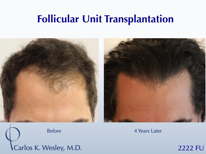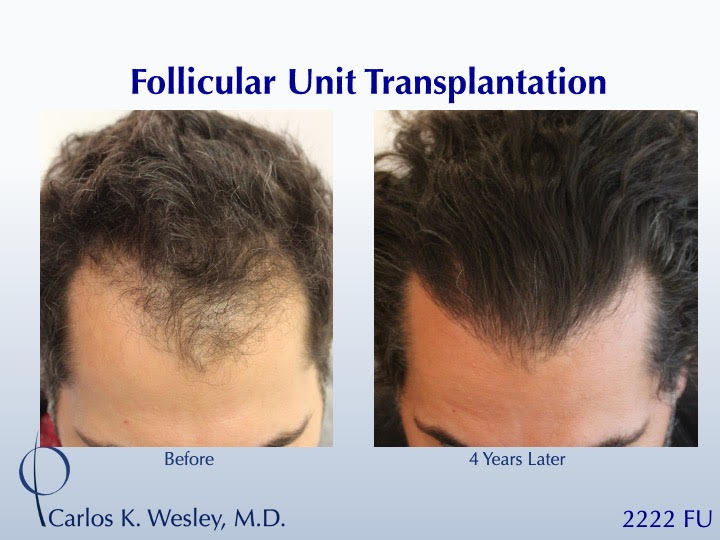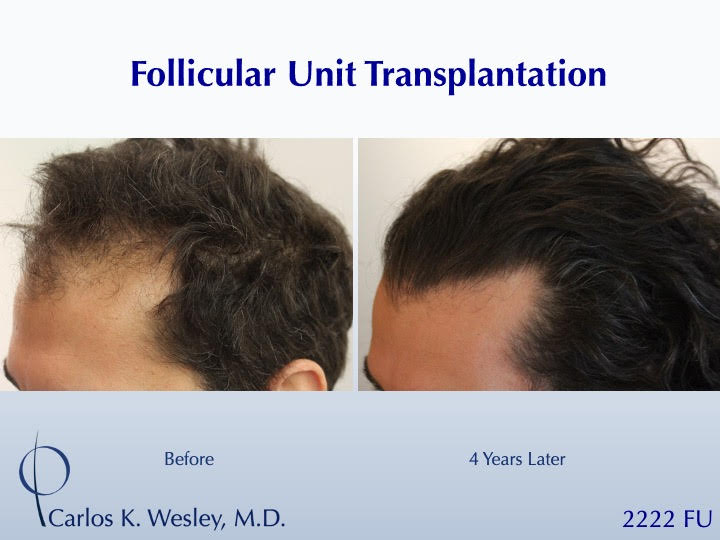 Sometimes, people just want to have long hair again. Since the anagen (growth) phase of the transplanted follicles lasts nearly 7 years, patients are able to wear that hair at various lengths after their procedure. This 39-year-old man underwent a follicular unit transplantation (FUT) session with Dr. Carlos K. Wesley in which a total of 2222 grafts were placed. He loved being able to wear it long once again!