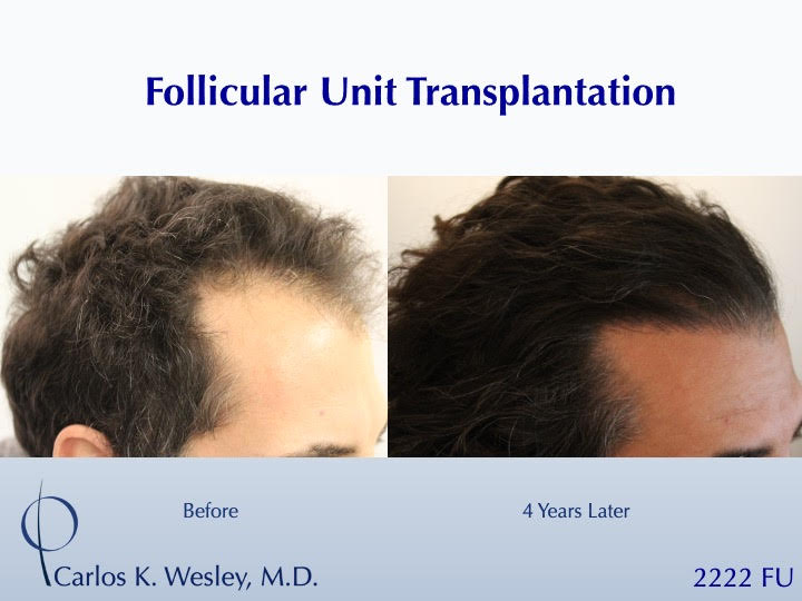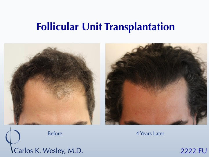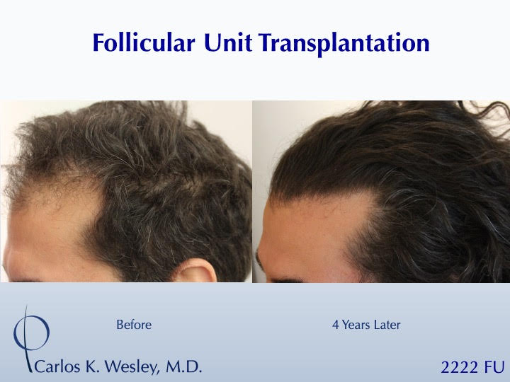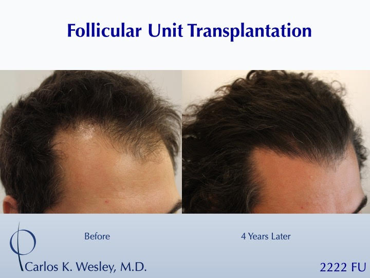 Sometimes, people just want to have long hair again. Since the anagen (growth) phase of the transplanted follicles lasts nearly 7 years, patients are able to wear that hair at various lengths after their procedure. This 39-year-old man underwent a follicular unit transplantation (FUT) session with Dr. Carlos K. Wesley in which a total of 2222 grafts were placed. He loved being able to wear it long once again!
