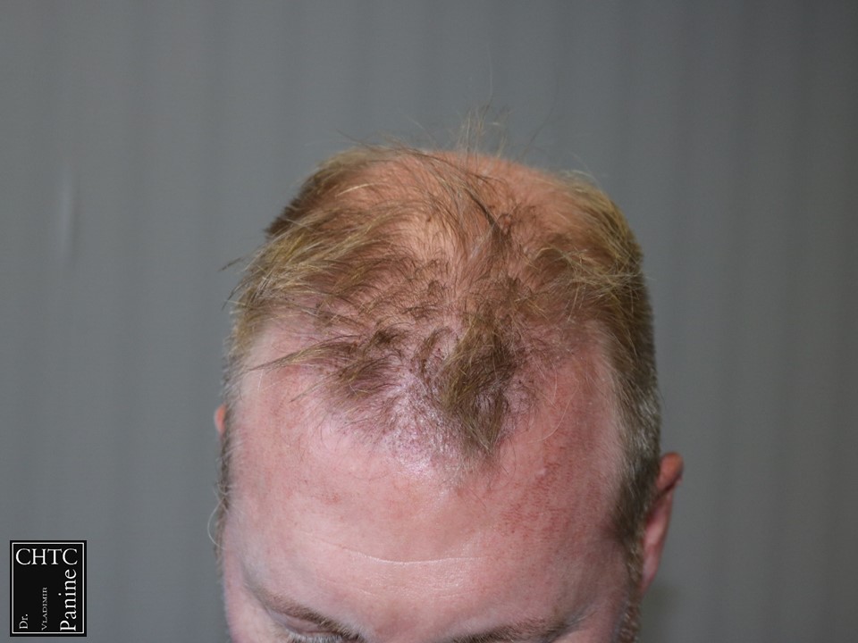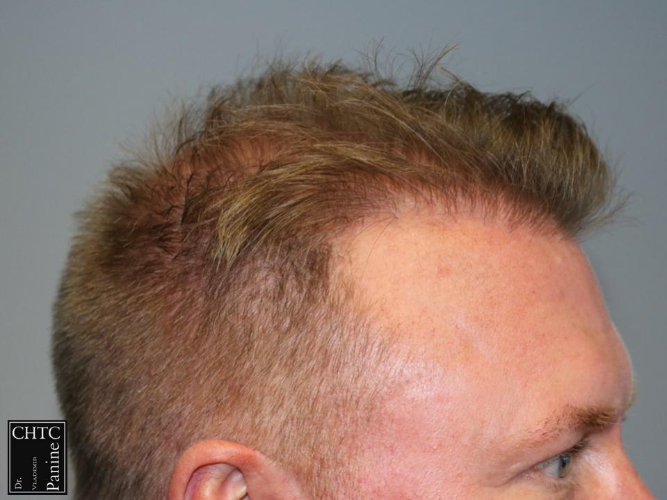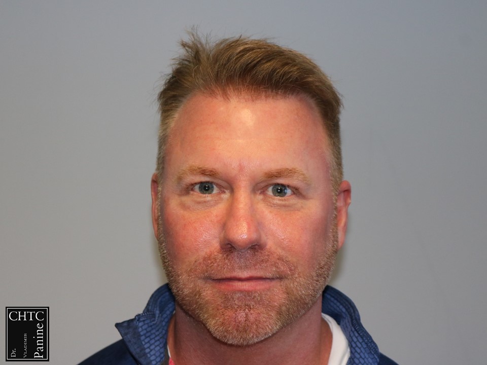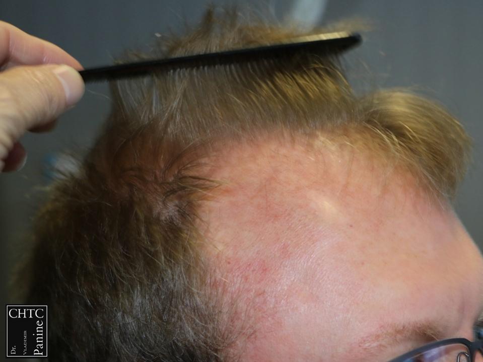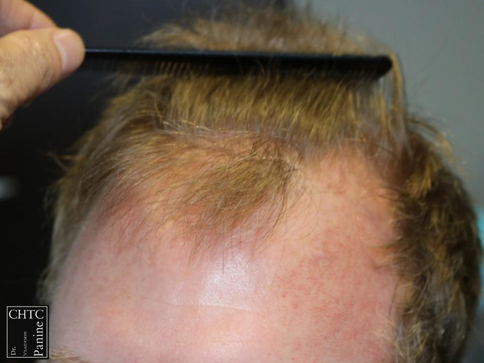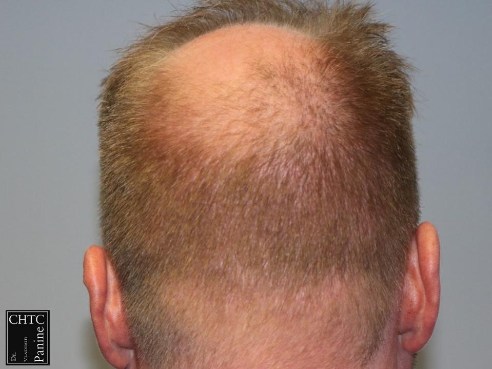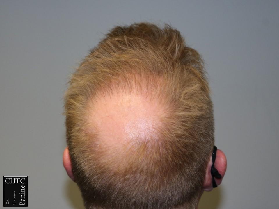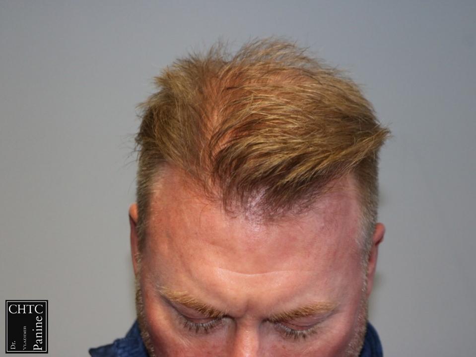 This 50-year-old gentleman had a hair loss pattern similar to a class 3v on the Hamilton Norwood hair loss scale. His goal was to rebuild a conservative hairline, add density to the frontal 1/3 of his scalp and shrink the bald spot in the crown area.