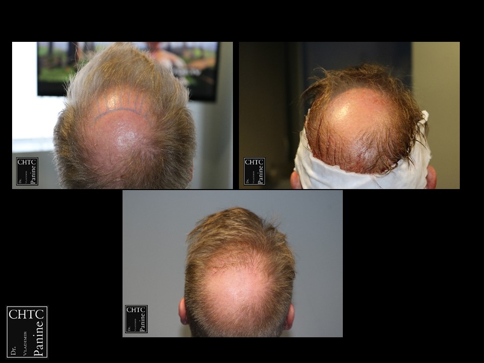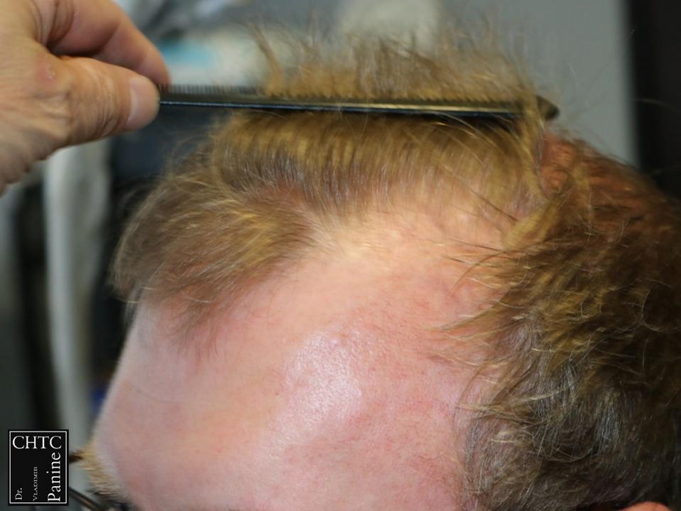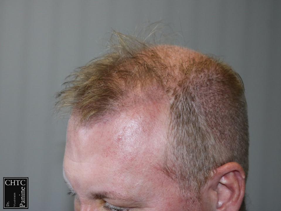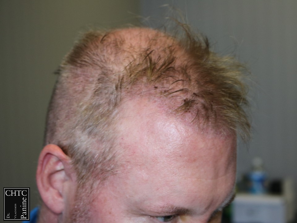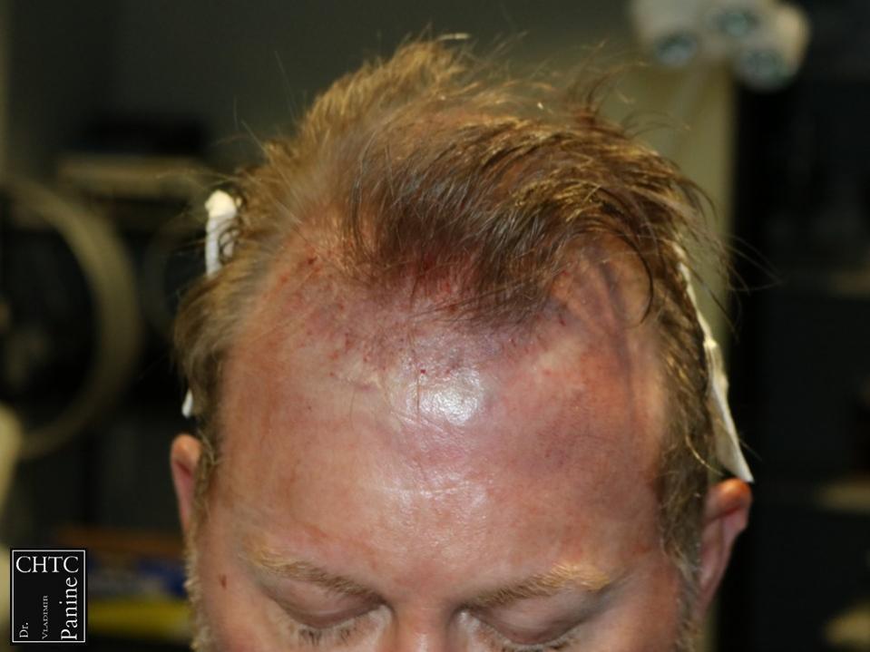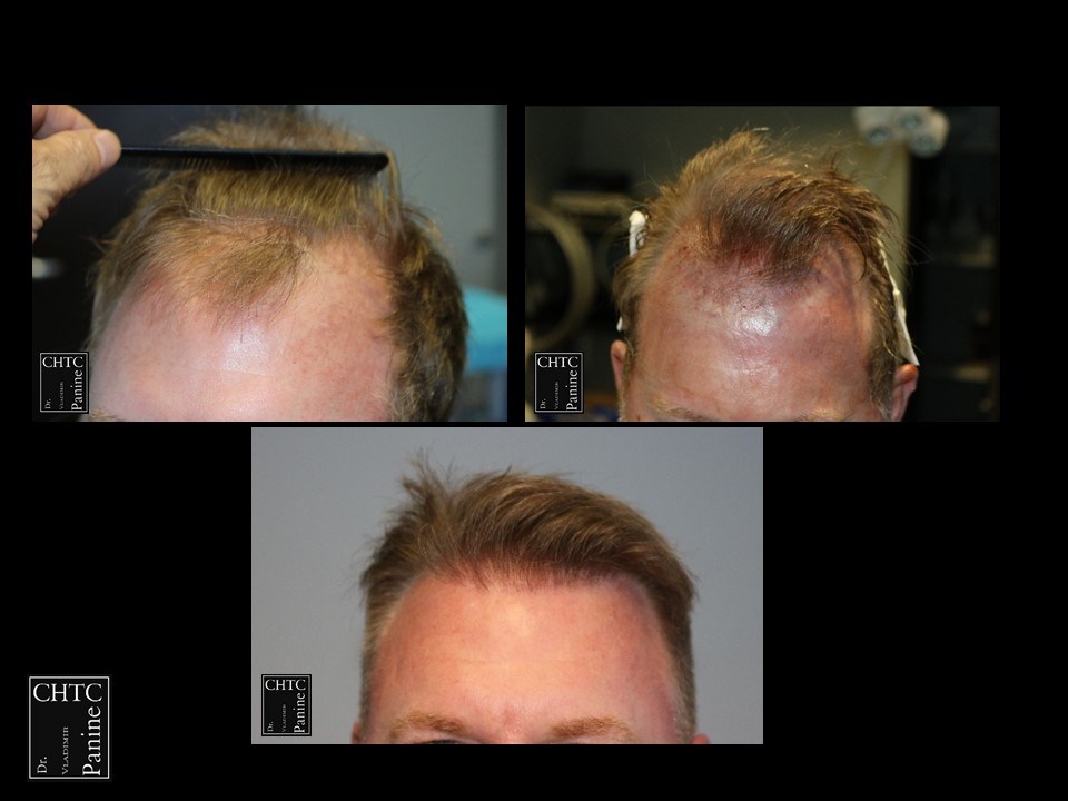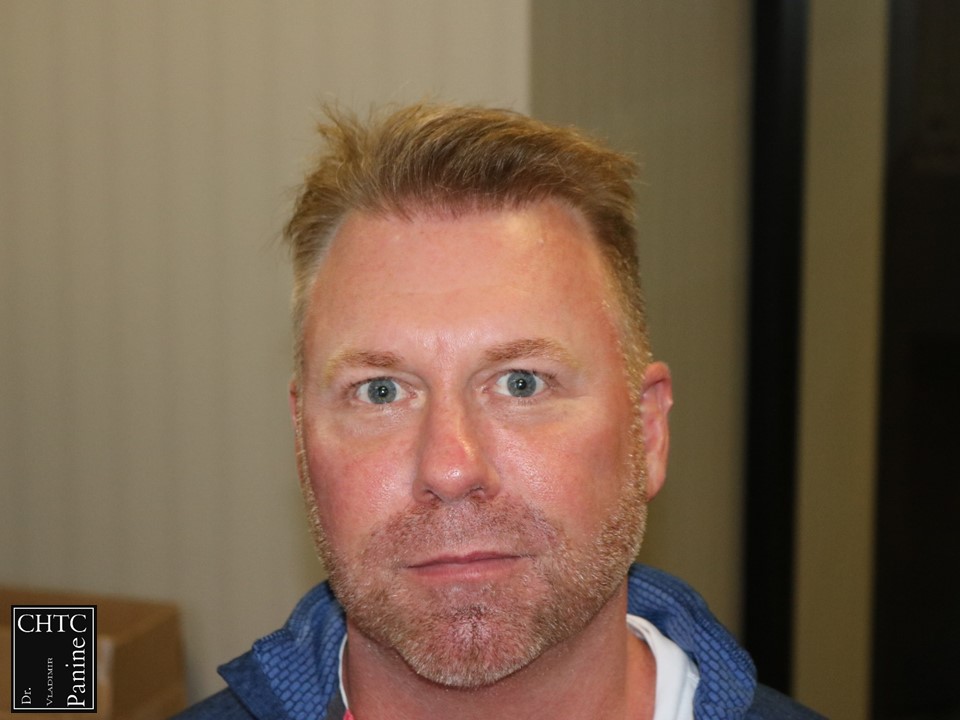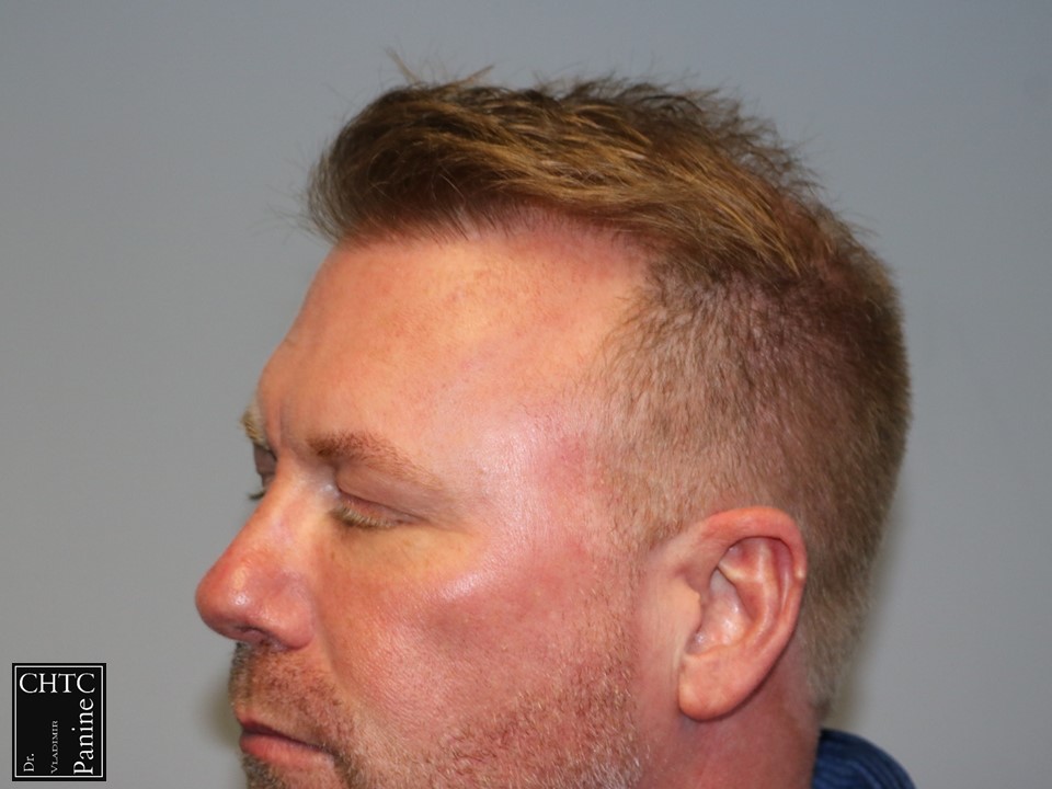 This 50-year-old gentleman had a hair loss pattern similar to a class 3v on the Hamilton Norwood hair loss scale. His goal was to rebuild a conservative hairline, add density to the frontal 1/3 of his scalp and shrink the bald spot in the crown area.