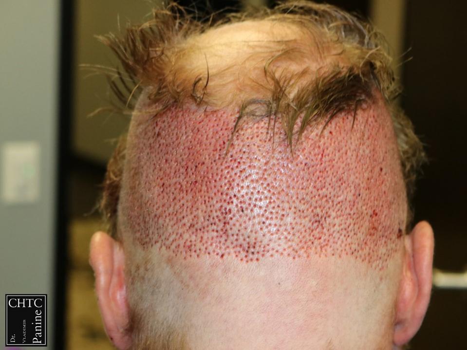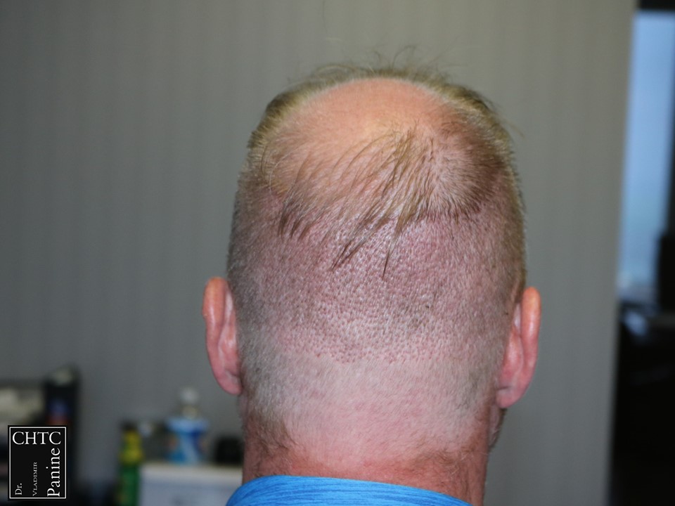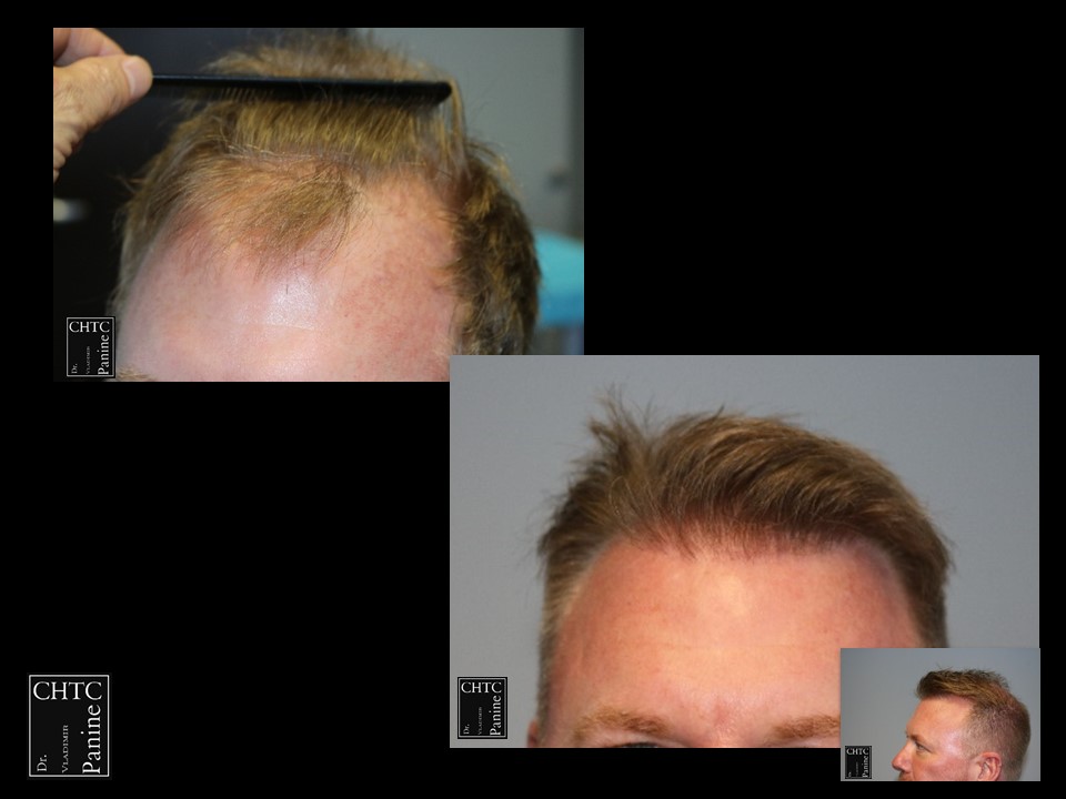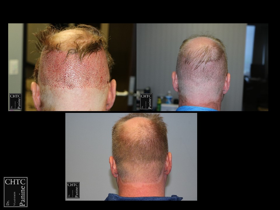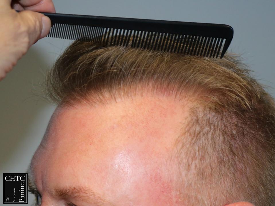 A total of 2,186 grafts were used in the hairline and frontal 1/3 of his head and 400 grafts were used into the vertex area to help shrink the bald spot in the back area. I used a significant amount of single hair follicular units which allowed me to create a very natural hairline. This action will allow him to comb his hair without anyone detecting that he has had anything done. These are his results at 1-week post-op and 9 months post-op. The patient is extremely happy and has schedule a second procedure to have his crown filled in. I will update his crown results down the road.