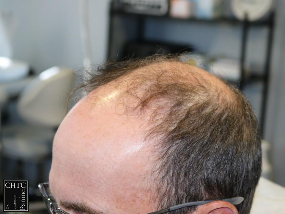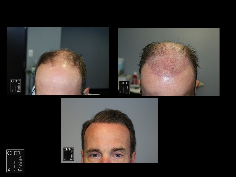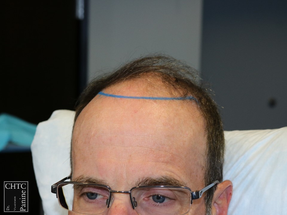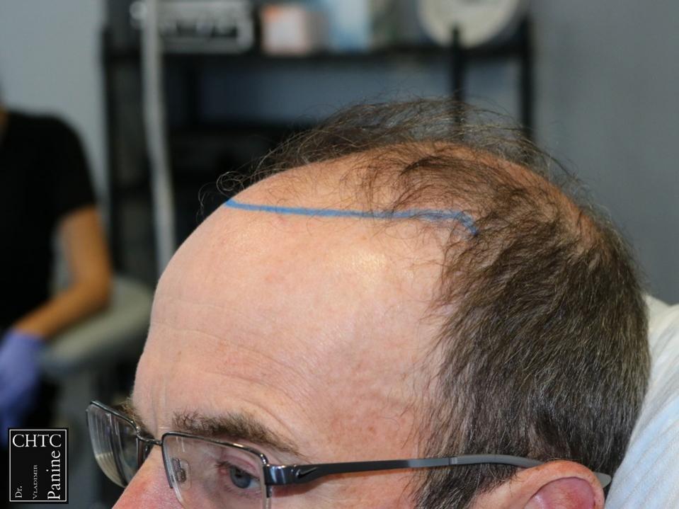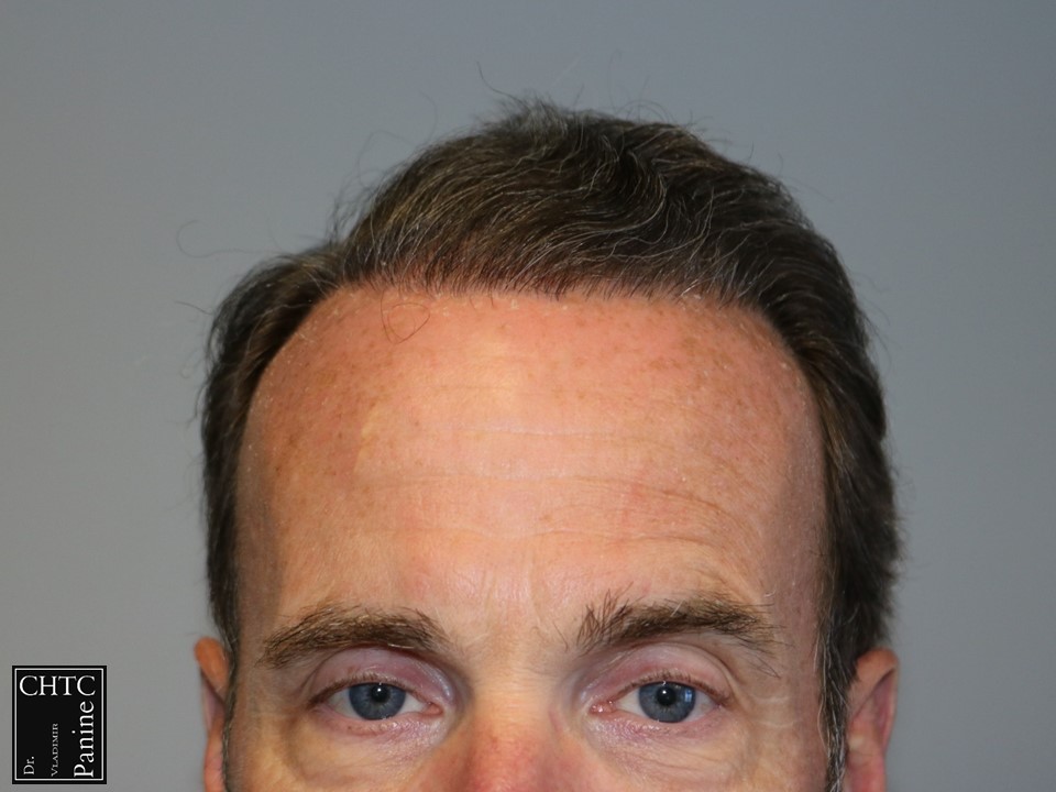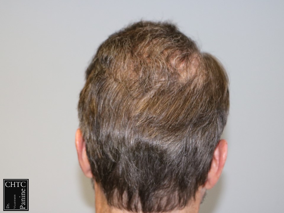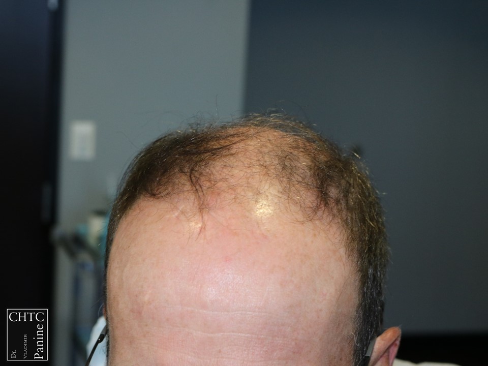 This gentleman was in his mid-50’s and had a hair loss pattern similar to a class 5v on the Hamilton Norwood hair loss scale. His goal was to get as much coverage as possible. With his degree of hair loss, I let him know it would take 2 procedures.