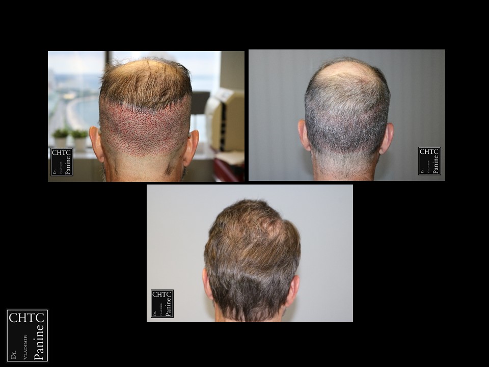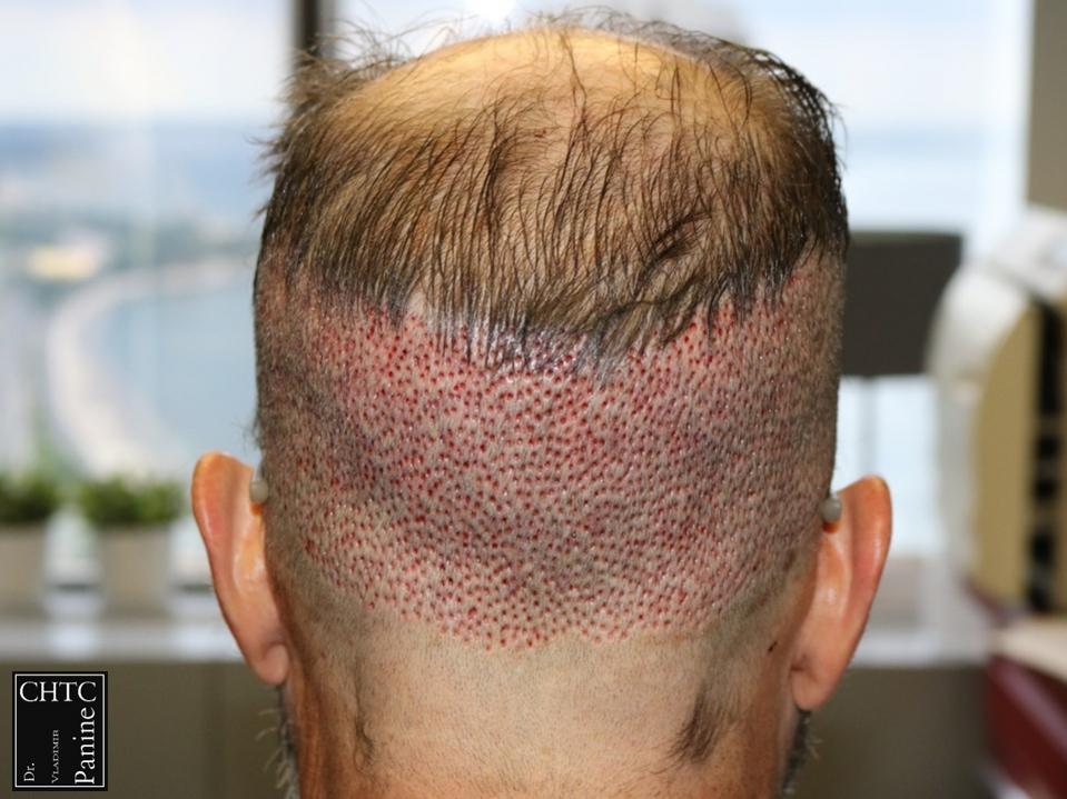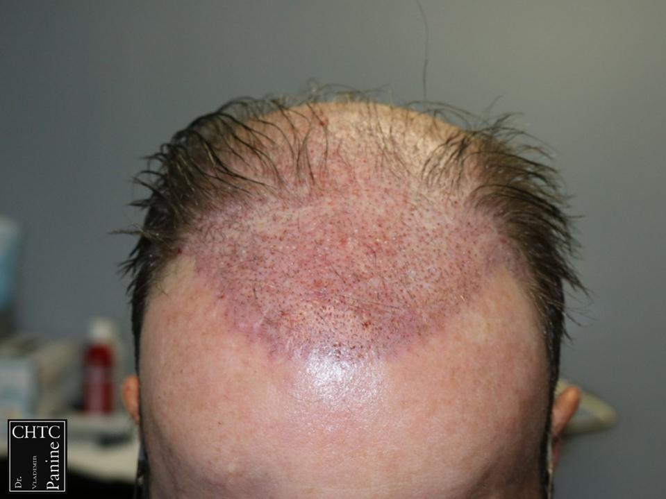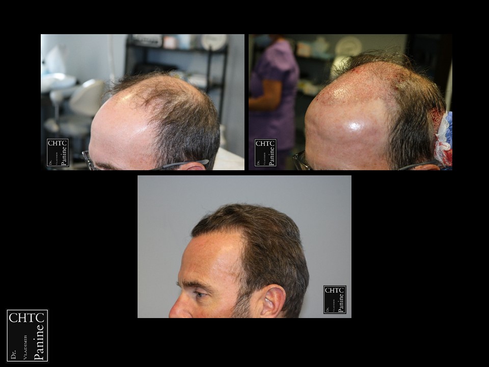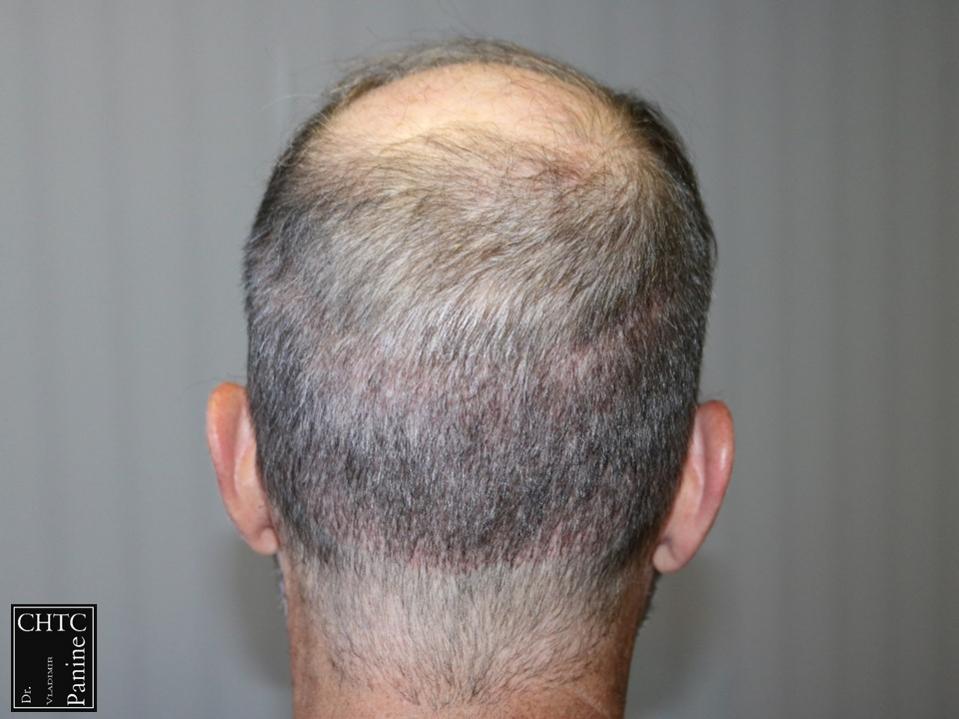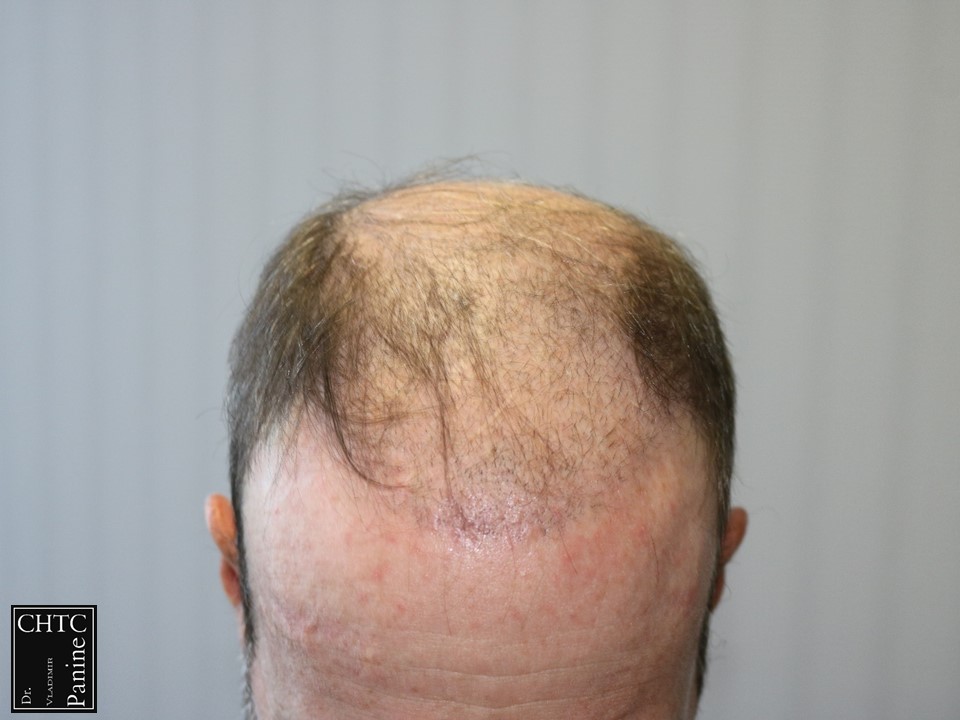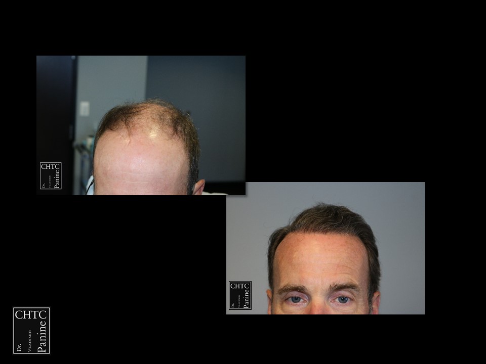 This gentleman was in his mid-50’s and had a hair loss pattern similar to a class 5v on the Hamilton Norwood hair loss scale. His goal was to get as much coverage as possible. With his degree of hair loss, I let him know it would take 2 procedures.