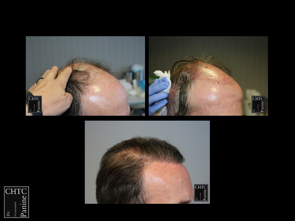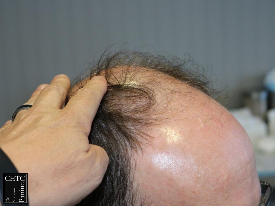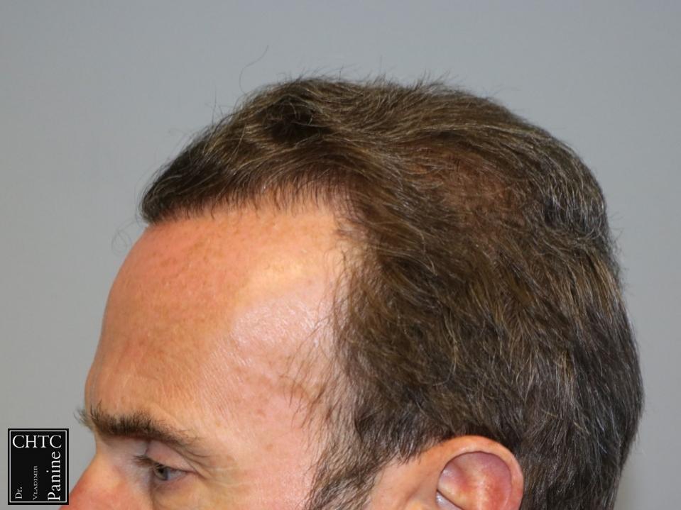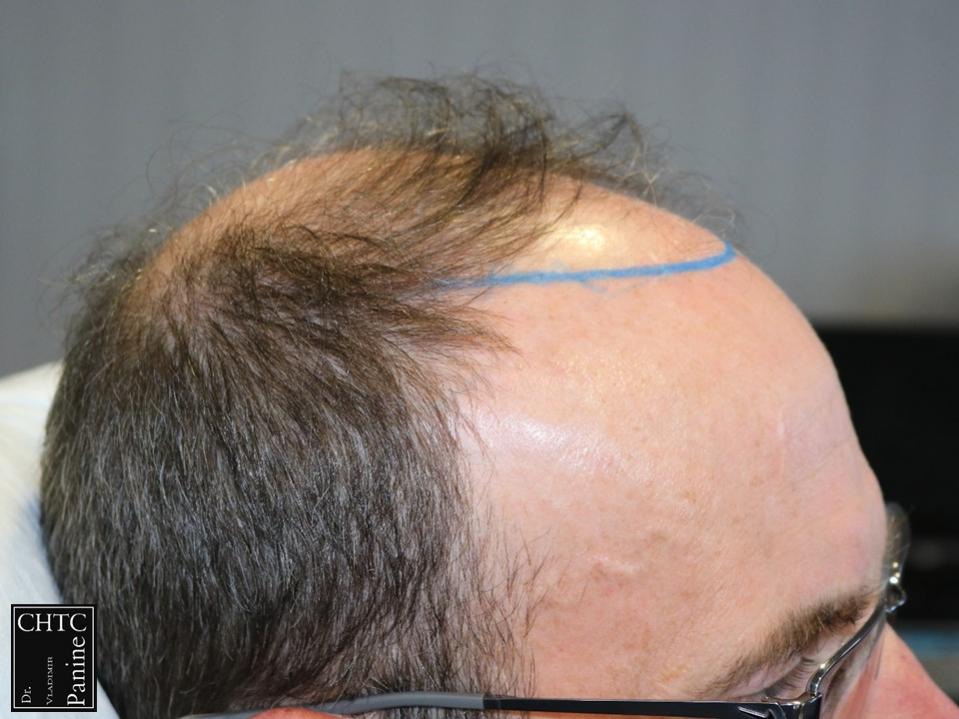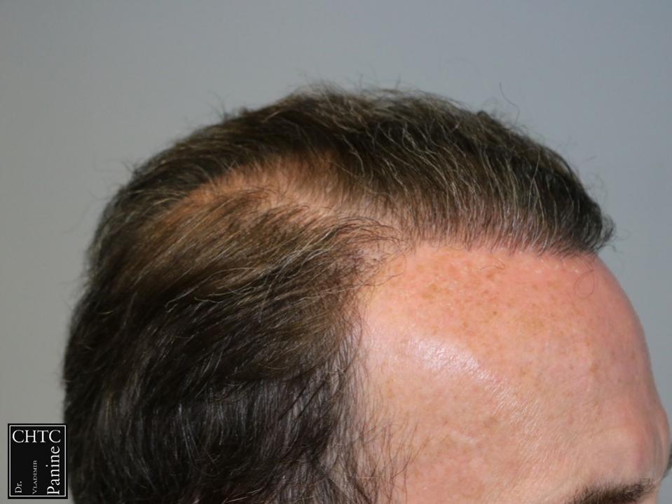 Taking his age and degree of hair loss into consideration, we discussed his options and developed a surgical plan that would work well with his expectations. I paid careful attention to his hairline as I wanted to reconstruct a hairline that would be suitable for him as he continued to age and allow me to still give him some coverage in the crown. I used a significant amount of single hair follicular units which allowed me to create a very natural hairline. This action will allow him to comb his hair without anyone detecting that he has had anything done.
