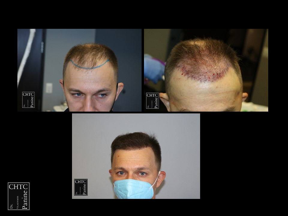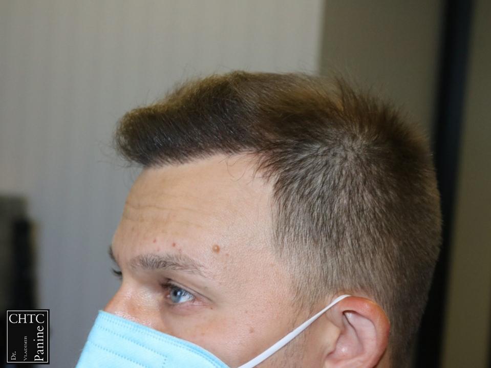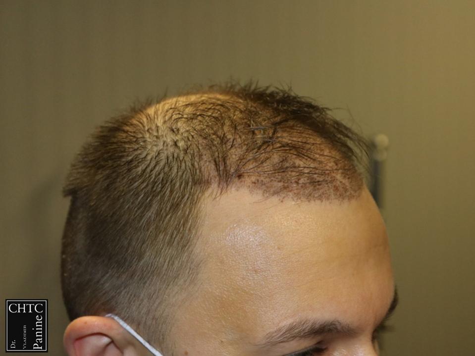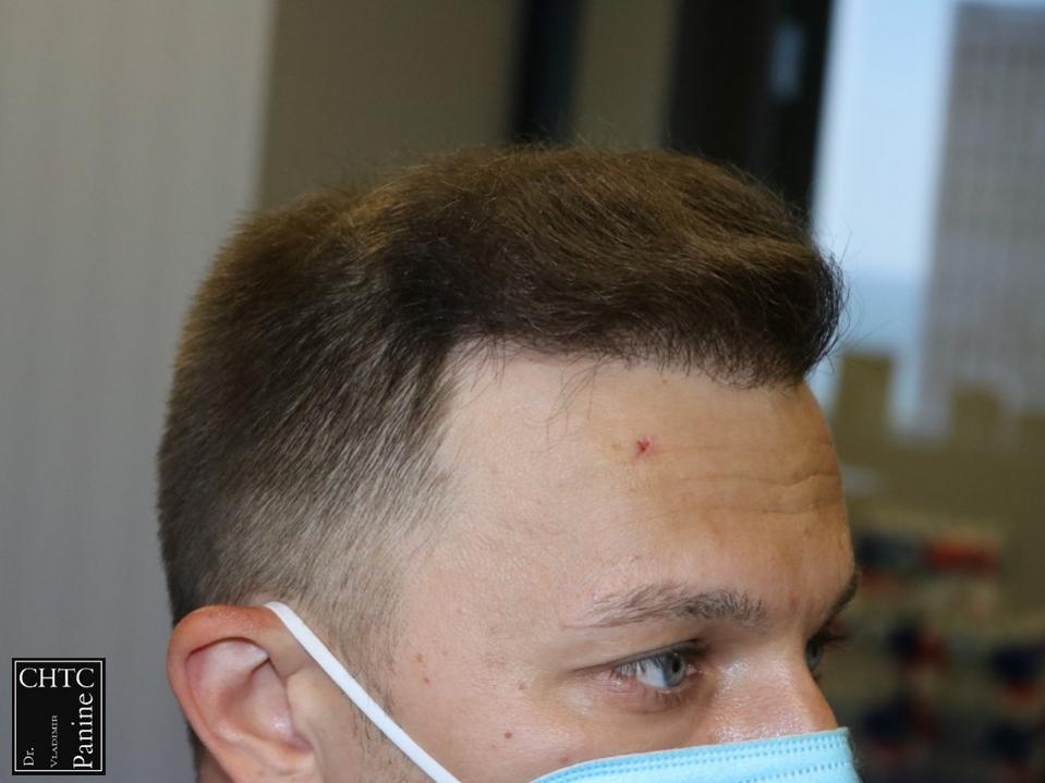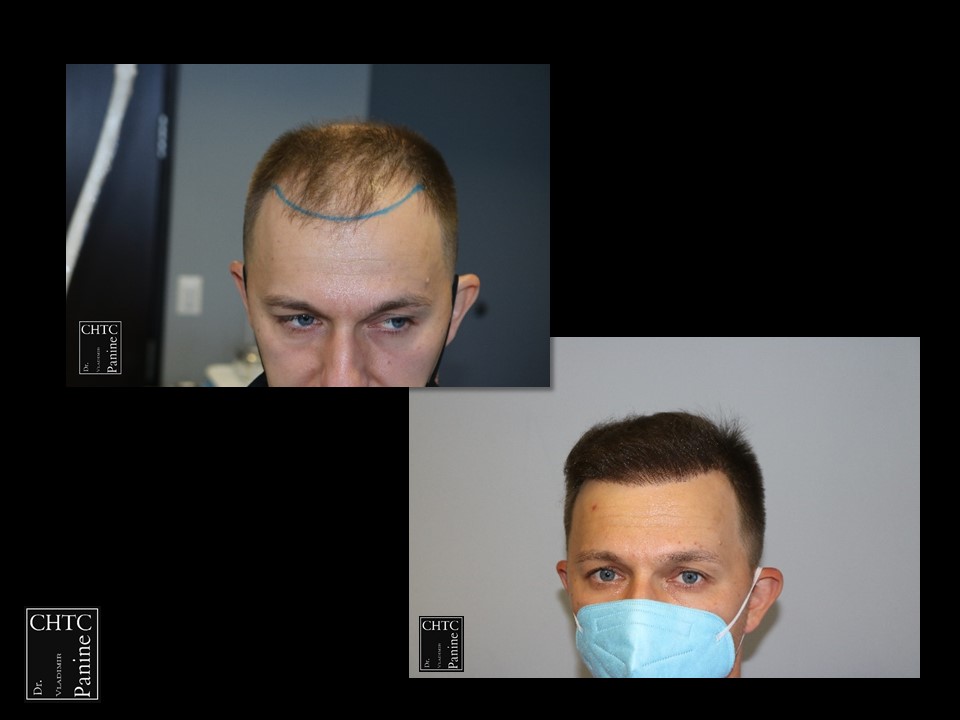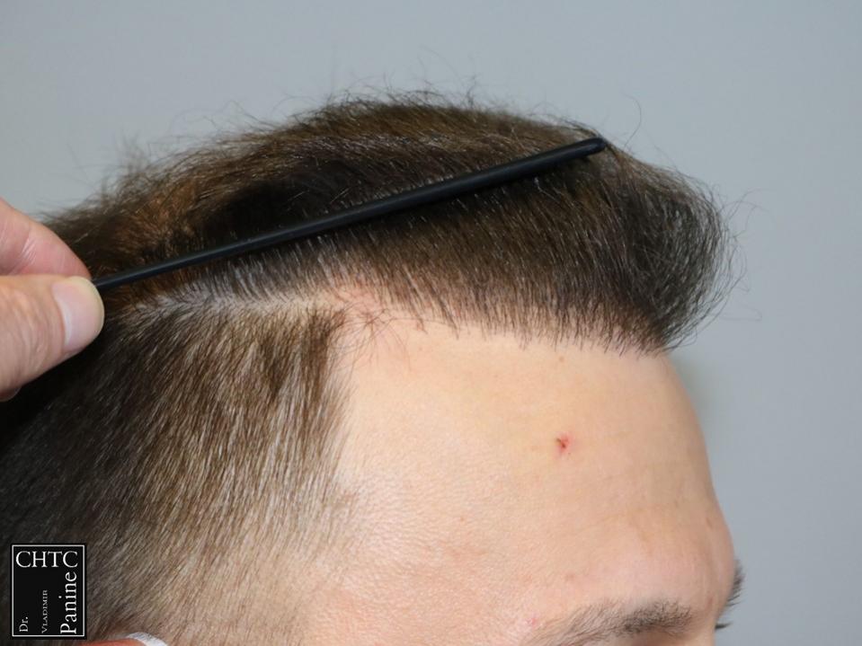 A total of 2,550 grafts were used in the frontal 1/2 of his head. I used 1,410 single hair follicular units which allowed me to create a very natural hairline. This action will allow him to comb his hair without anyone detecting that he has had anything done.