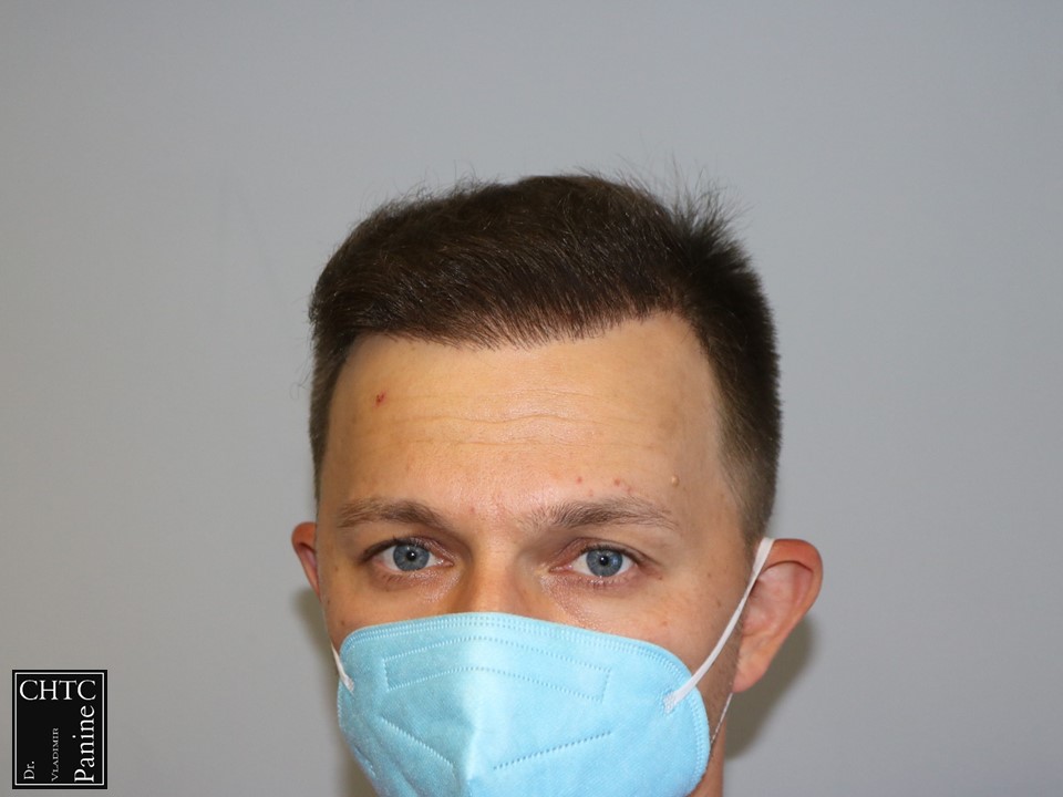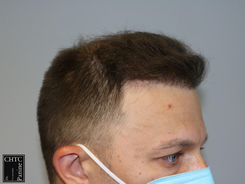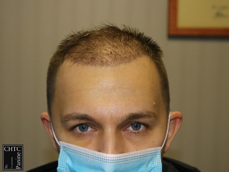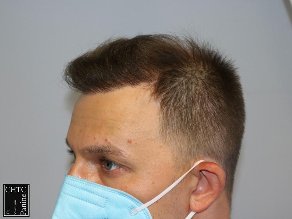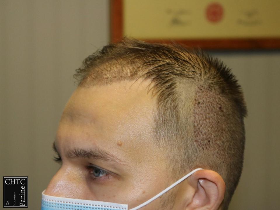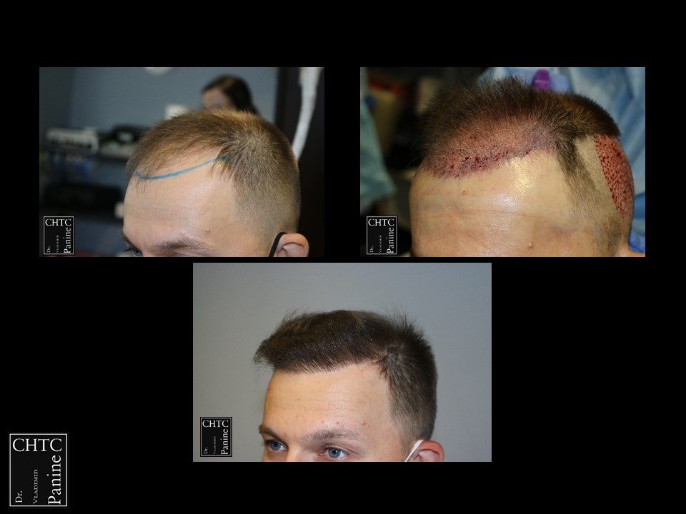 A total of 2,550 grafts were used in the frontal 1/2 of his head. I used 1,410 single hair follicular units which allowed me to create a very natural hairline. This action will allow him to comb his hair without anyone detecting that he has had anything done.