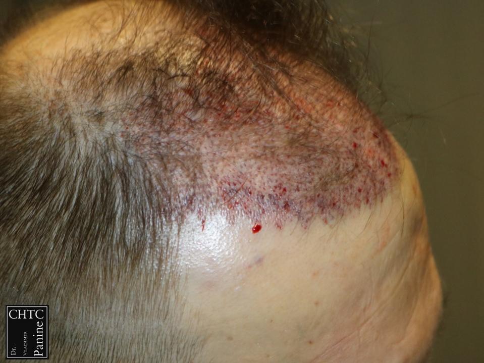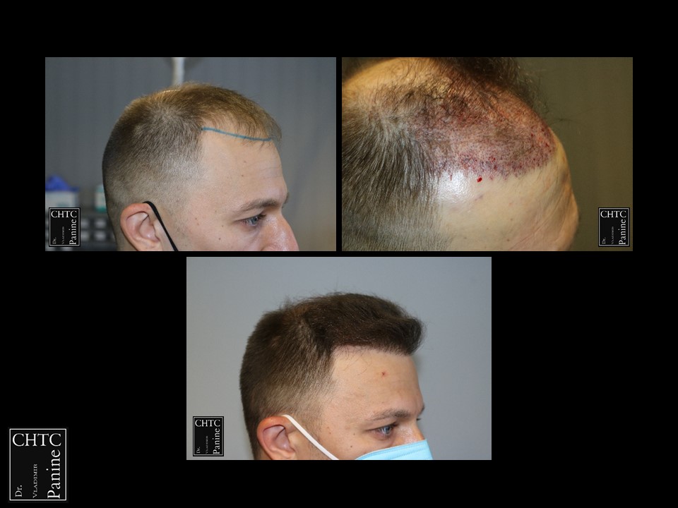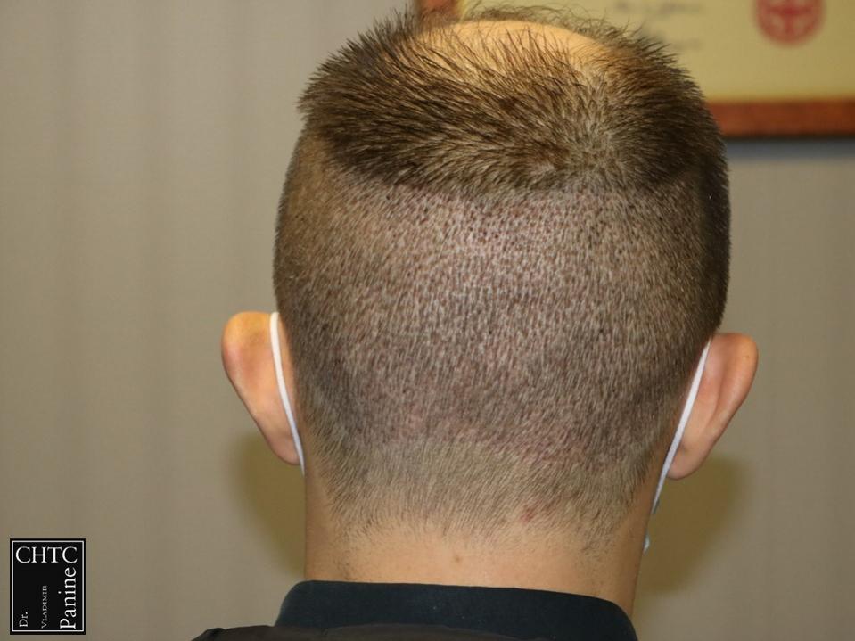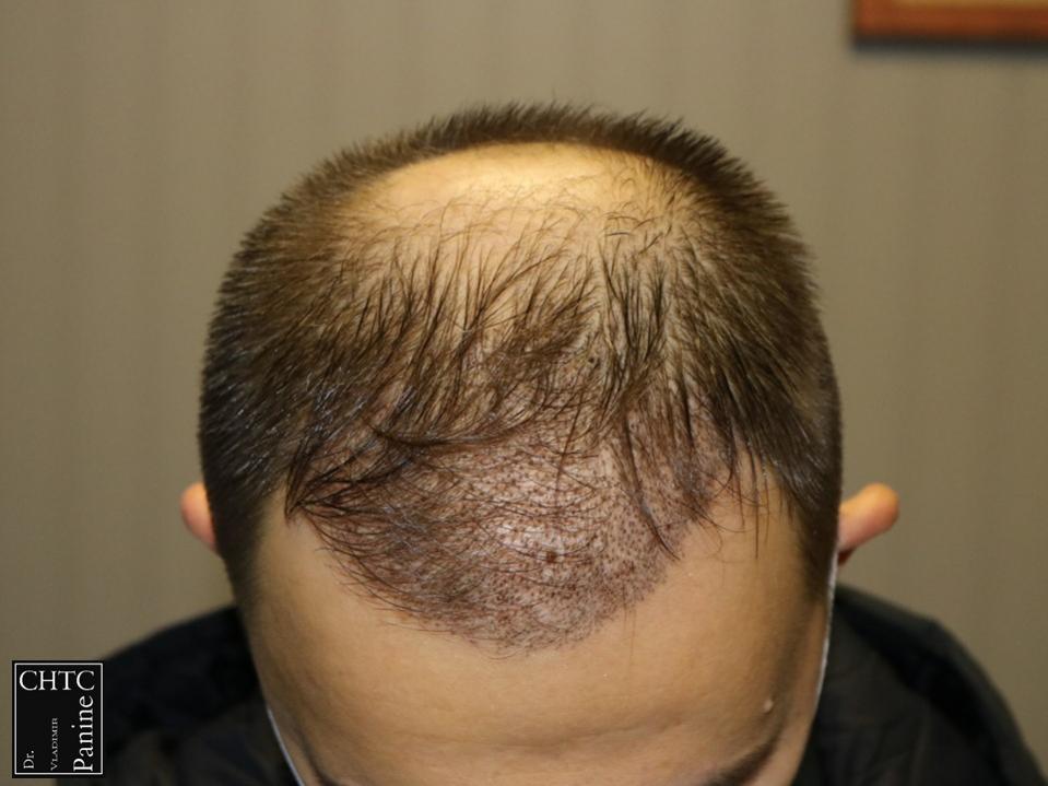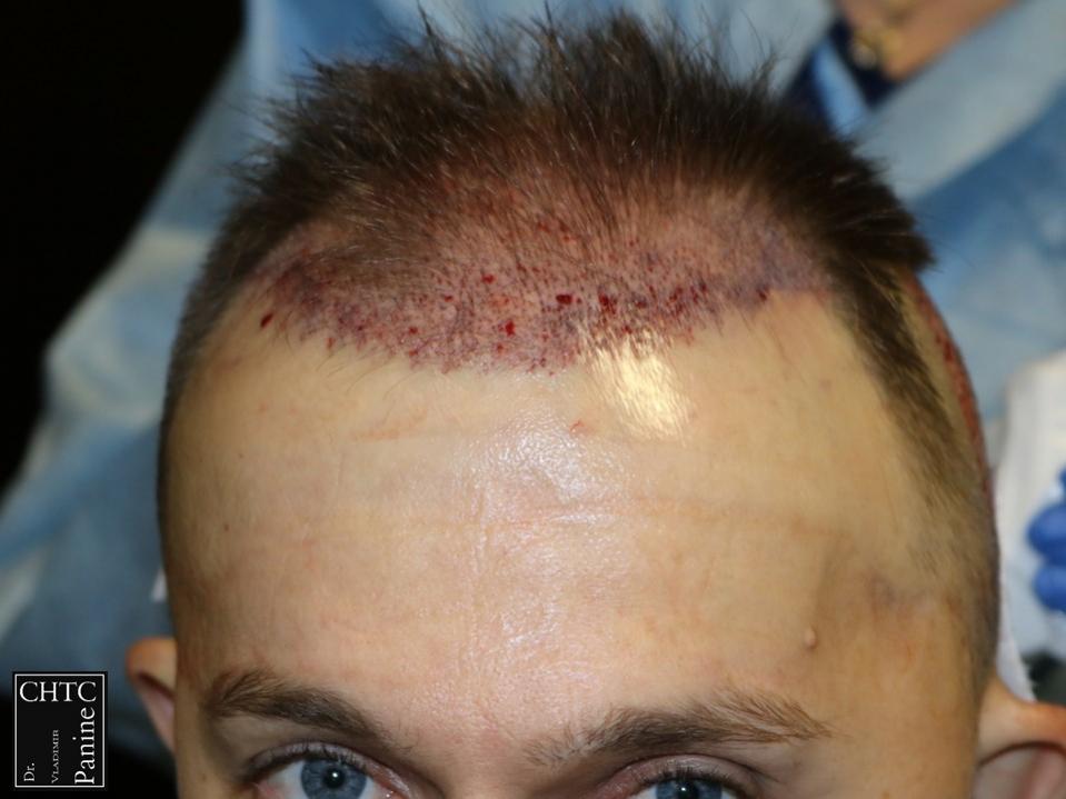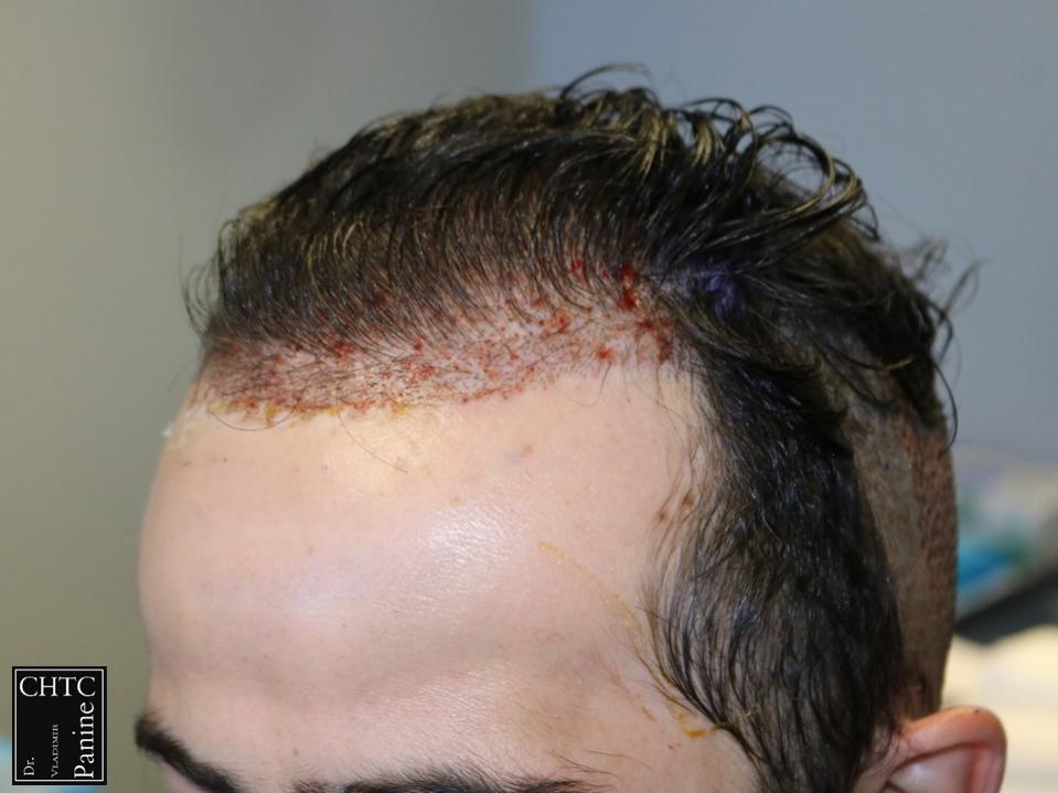 A total of 2,550 grafts were used in the frontal 1/2 of his head. I used 1,410 single hair follicular units which allowed me to create a very natural hairline. This action will allow him to comb his hair without anyone detecting that he has had anything done.