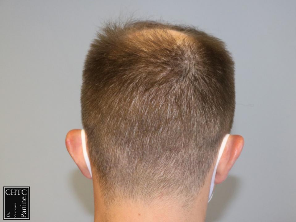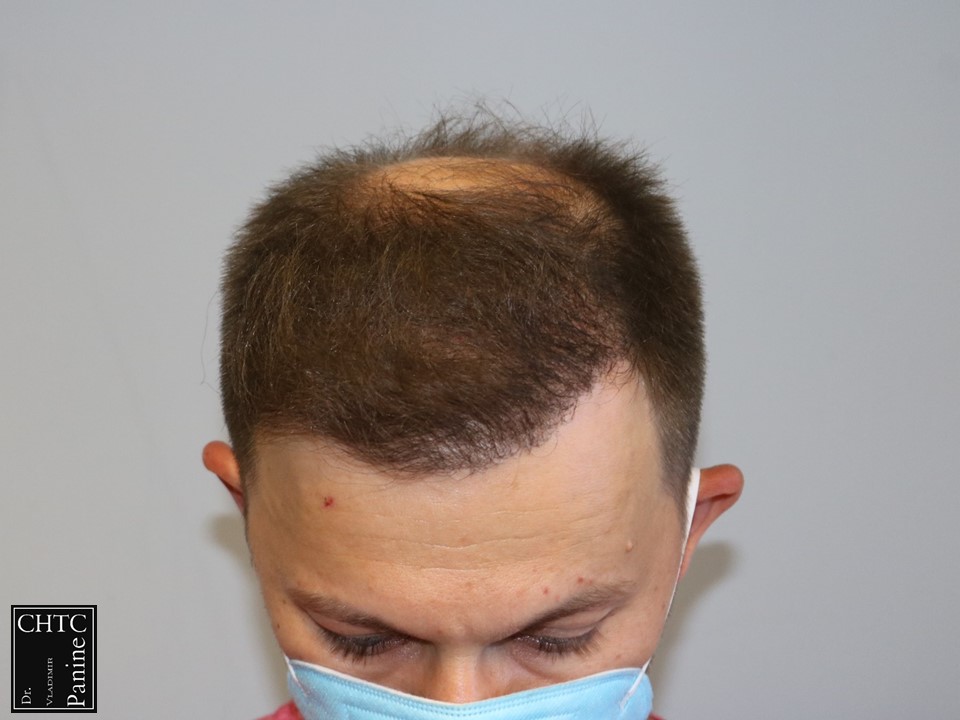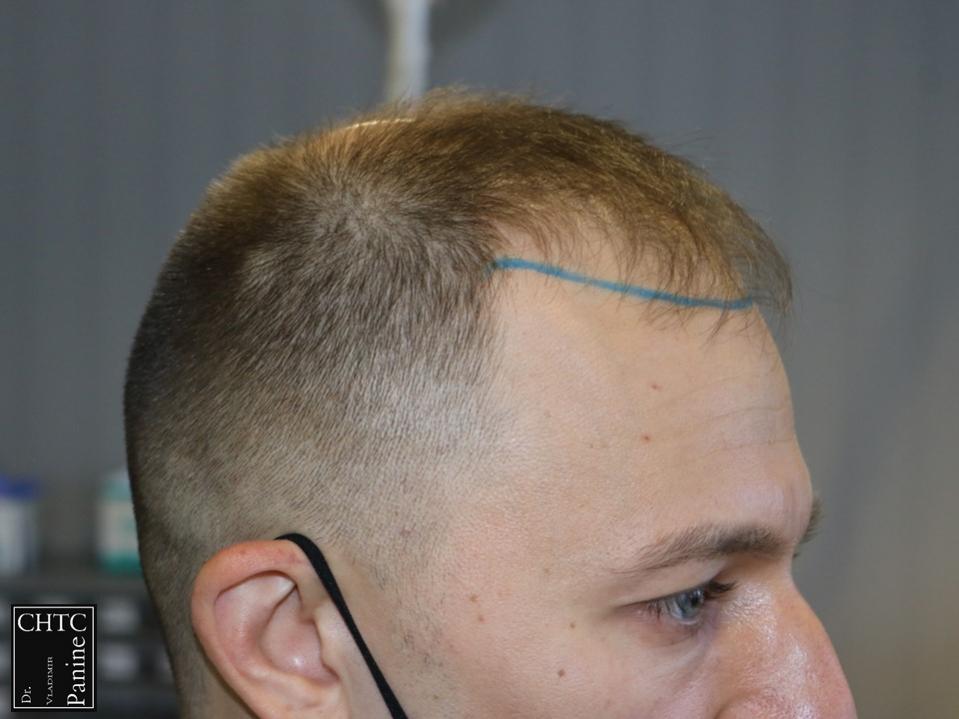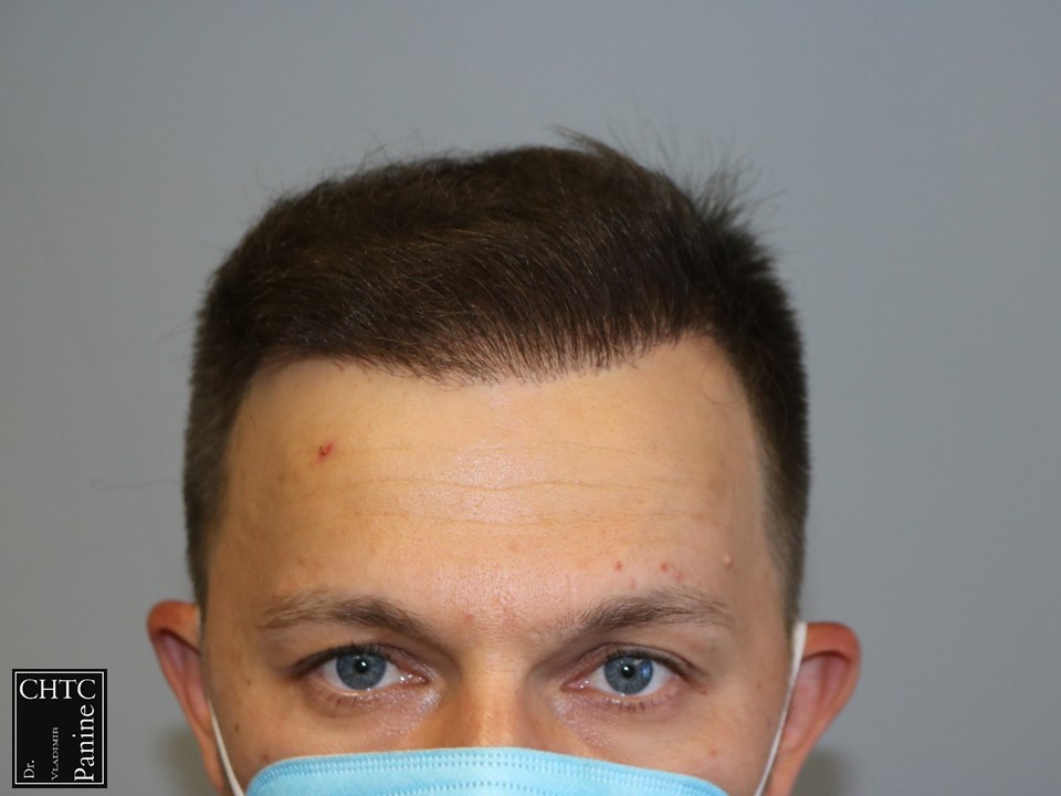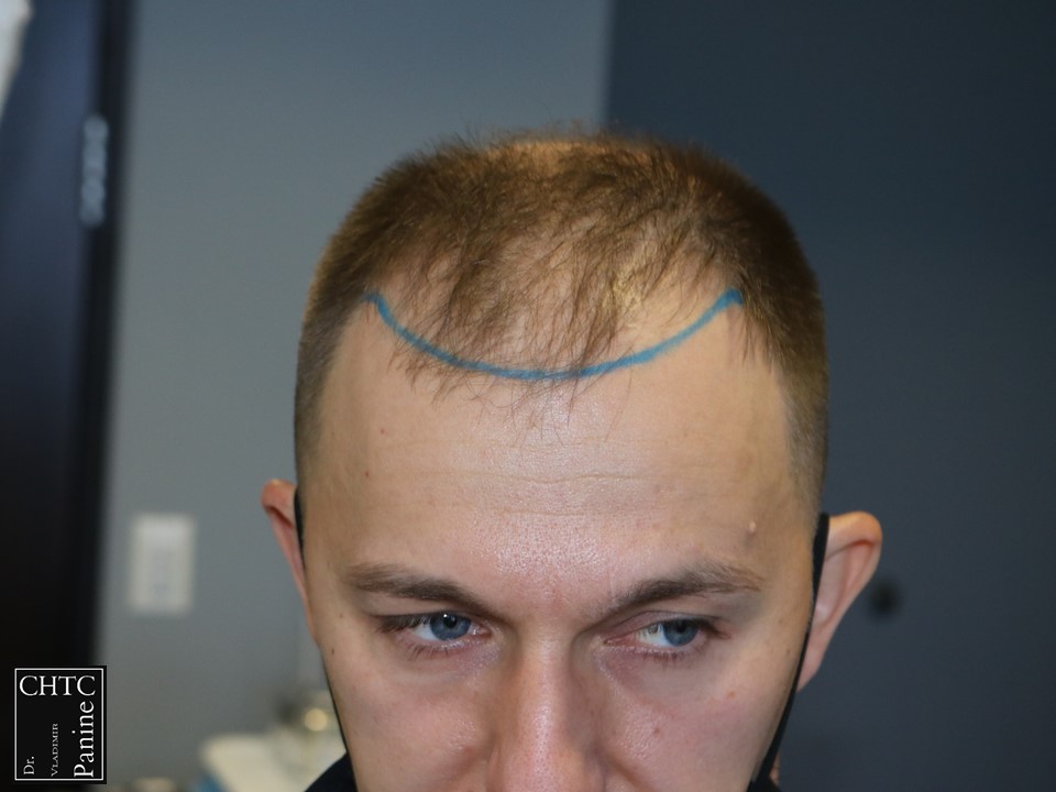 This 27-year-old gentleman had a hair loss pattern of a class 4v on the Hamilton Norwood hair loss scale. His goal was to rebuild his hairline and add density to the frontal 1/2 of his scalp.