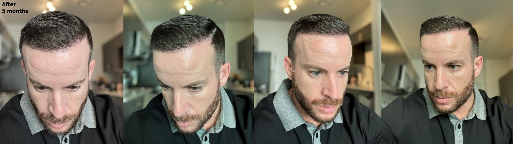 This patient had a 2,600 graft FUE procedure + PRP with Dr. Baubac in our Beverly Hills Clinic in March of 2021. The patient experienced very yearly growth at 4 months post op as seen in the 4 month after photos due to having PRP with he procedure. We have also included 5 months post op photos as well – the patient is well ahead of the normal growth schedule.