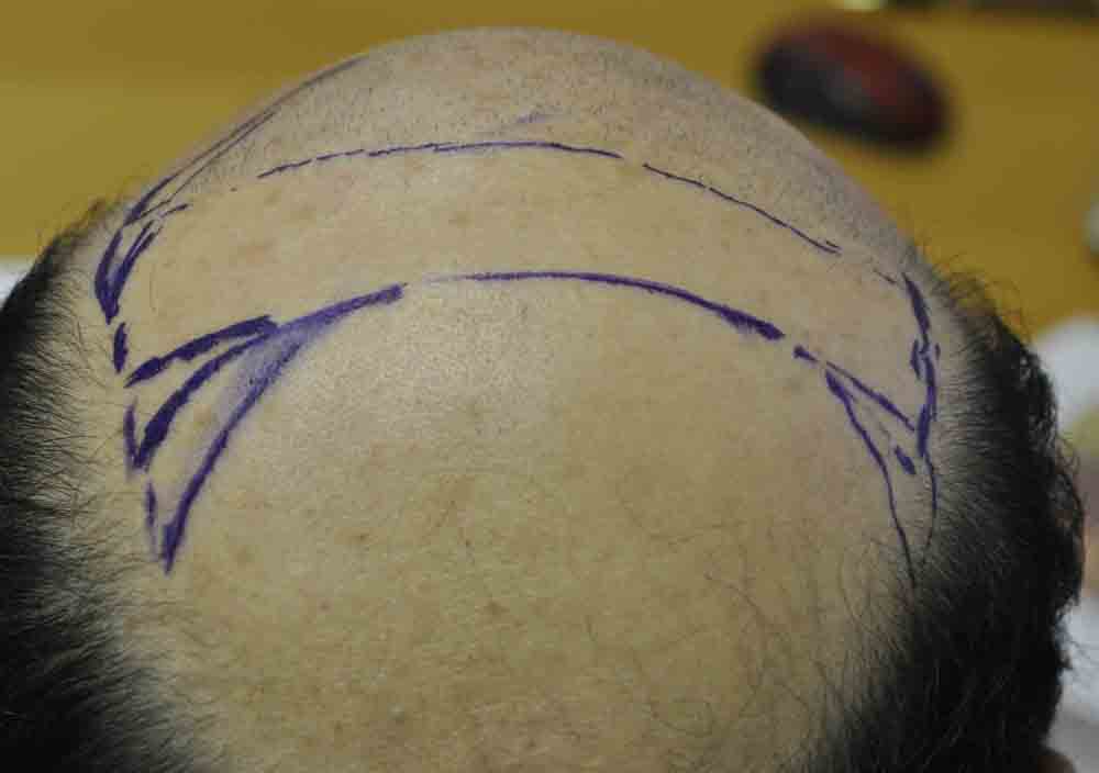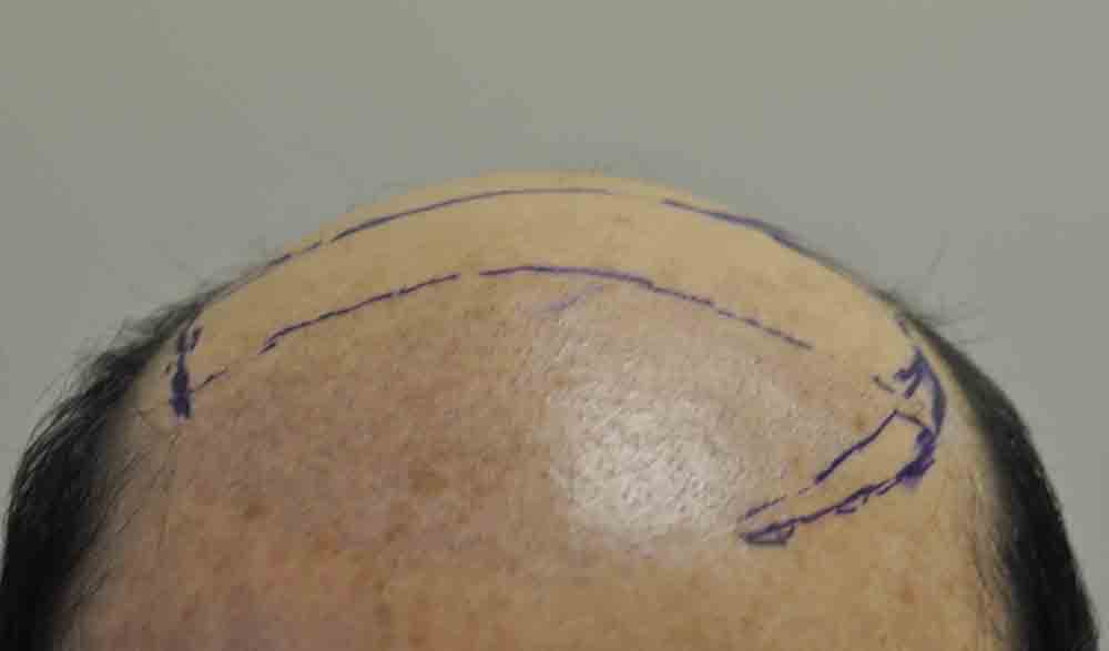 Shown are preop pics and intraop pics from an approximately 2700 graft case. As it turned out, he got up and left before all of his grafts were placed due to anxiety even after 3 valium pills. The only time we've had a case like that. I think we ended up with 300 grafts that we couldn't place at all. Then, he kept his head shaved for 6 months until we did a second case of around 2400 grafts. He again kept his head shaved until all the grafts started to grow in. I suspect he may have shaved out a few, but he has a nice result given his very thin donor hair and his very large area of scalp needing coverage.
